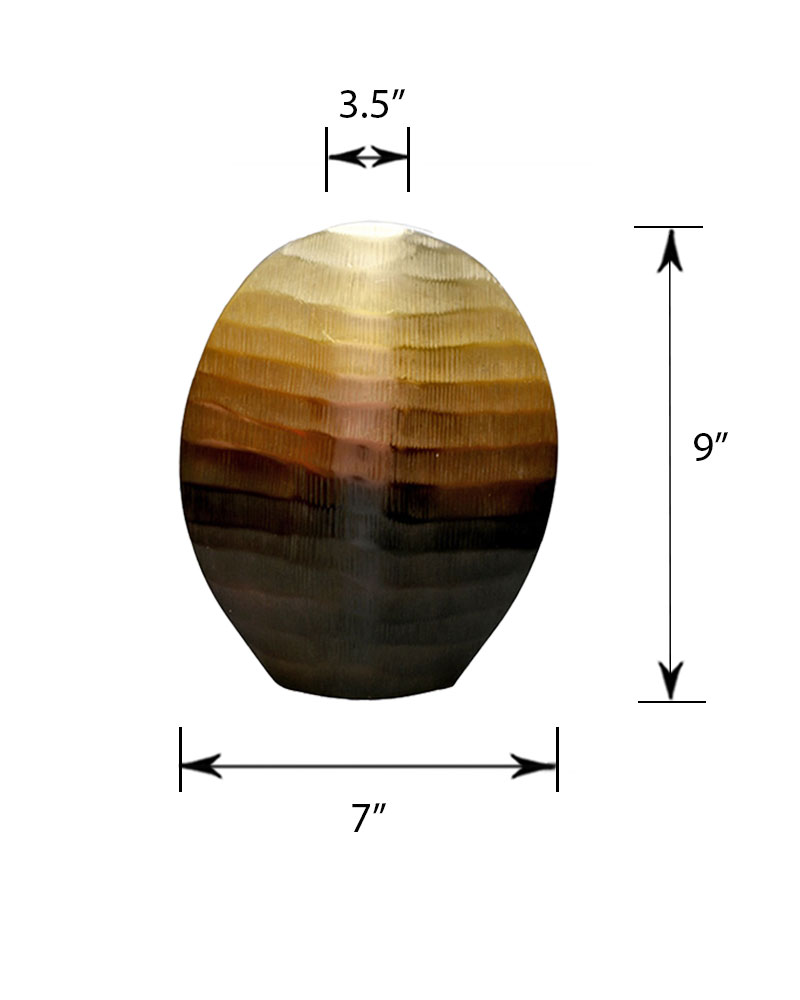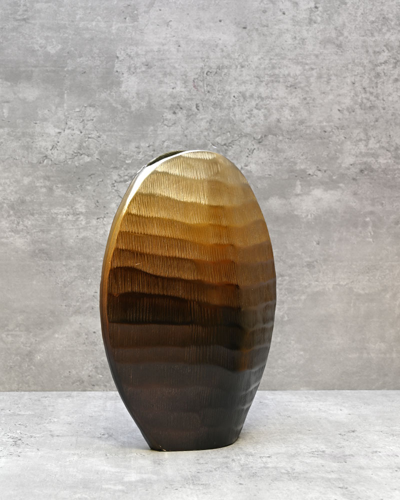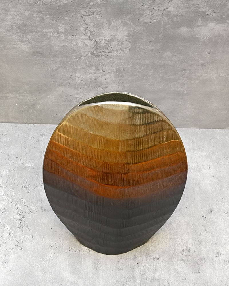 With its unique shape and striking colour pattern, this vase is sure to make a statement. The exterior features rippled horizontal lines that add texture and movement, while the blend of rich brown shades creates a warm, organic feel. Designed with a small opening, it’s perfect for a single, subtle bloom—or let it stand alone as an artful accent piece.