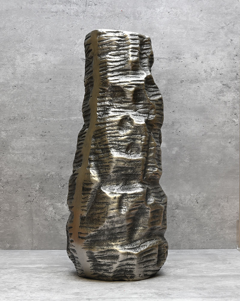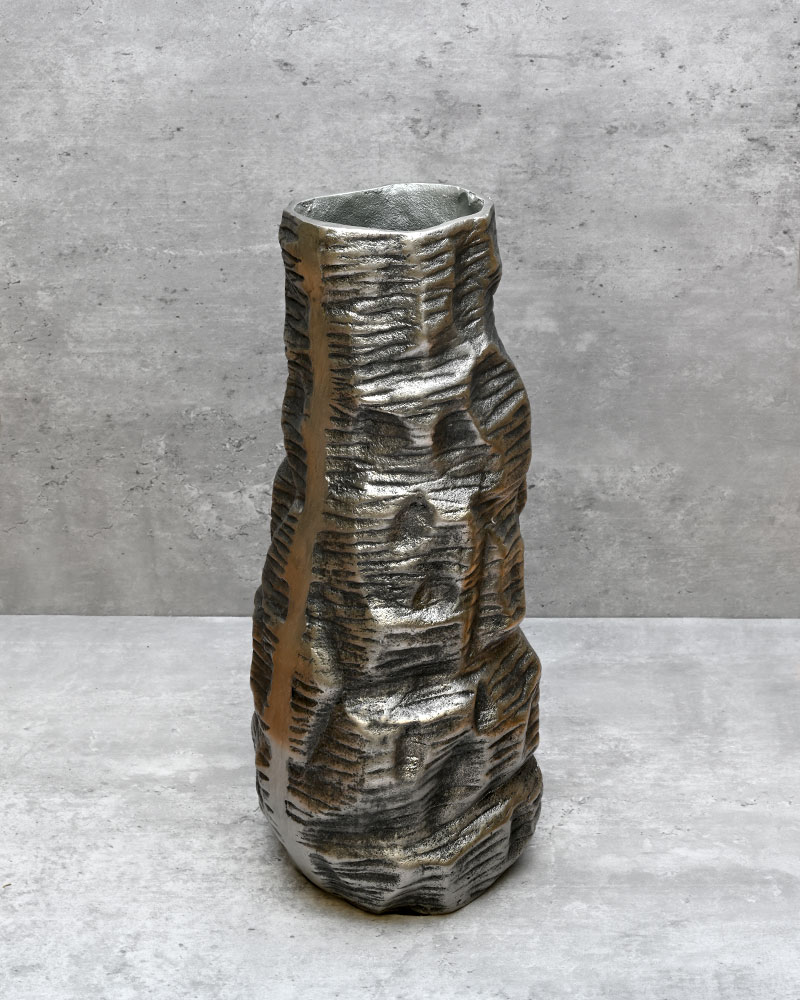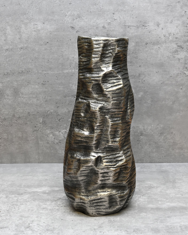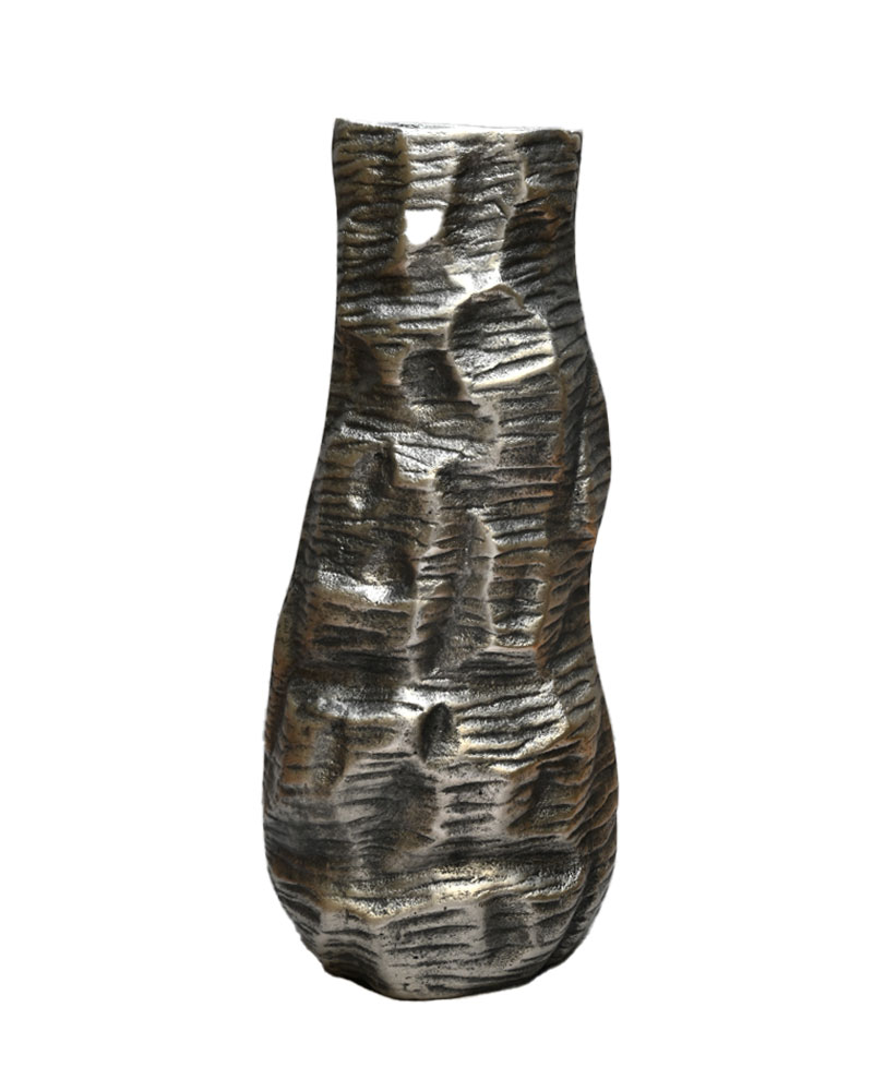 With its antique silver-coloured finish and scalloped, twisted shape, this unique vase is full of potential. Whether displayed on its own or paired with flowers or branches, it offers a striking and elegant look. Available in two sizes, they can be styled together for a more dramatic statement. This standout piece is sure to impress in any setting.