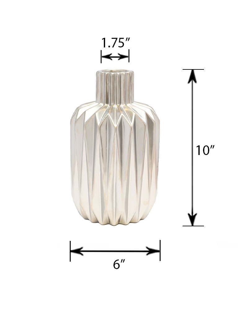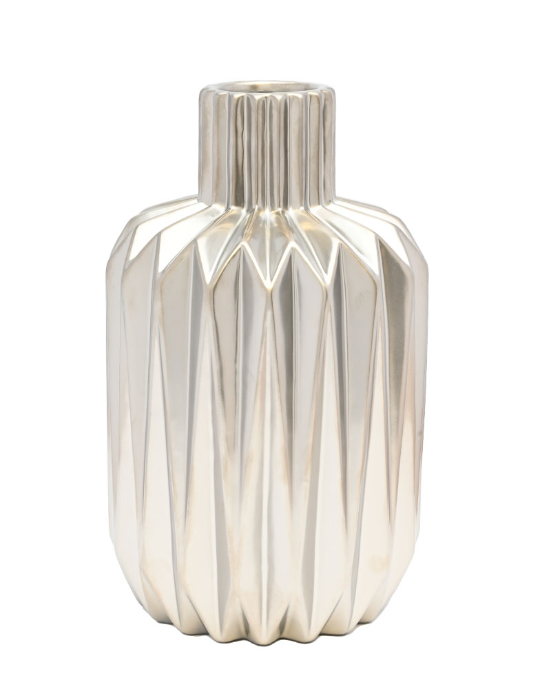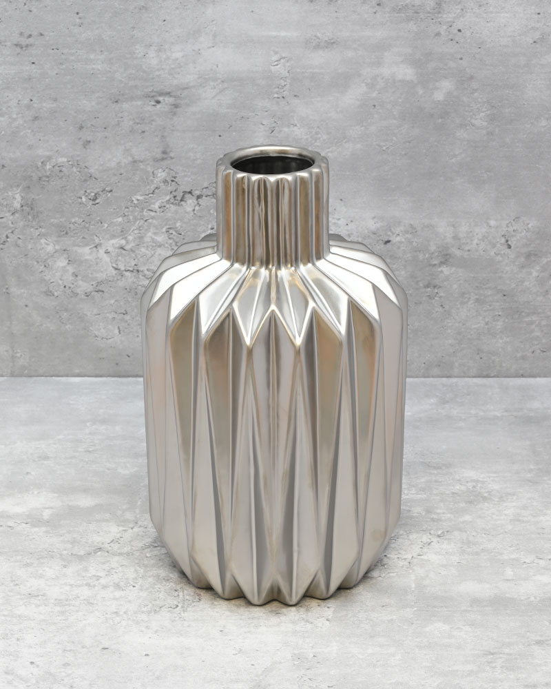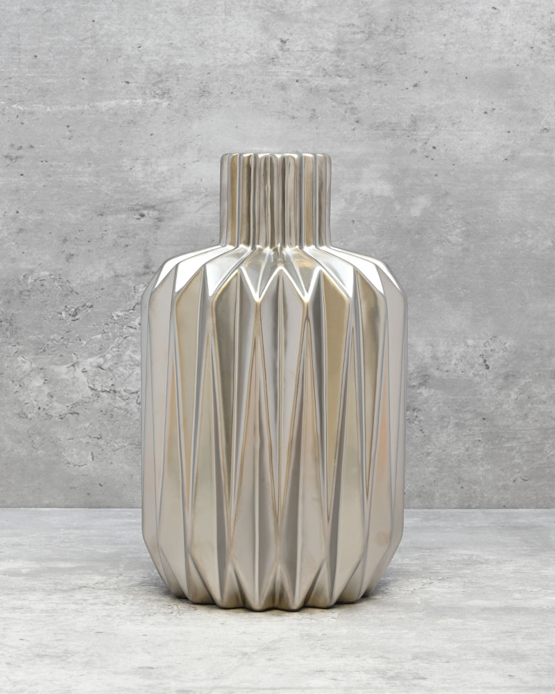 With its strong pleated design and matte silver finish, this vase offers a truly unique and eye-catching look. Its sculptural form adds visual interest to any shelf or counter, whether displayed on its own or paired with a striking floral arrangement. A standout piece that effortlessly blends modern elegance with artistic flair—this container won’t disappoint!