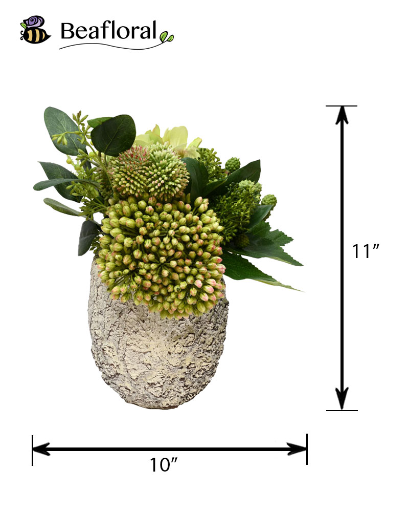 Inspired by nature, this arrangement showcases a richly textured container paired with a lush green canopy of hydrangeas and sedum. The combination creates a look that is both subtle and stylish—perfect for adding a fresh, natural touch to any space while maintaining an elegant simplicity.