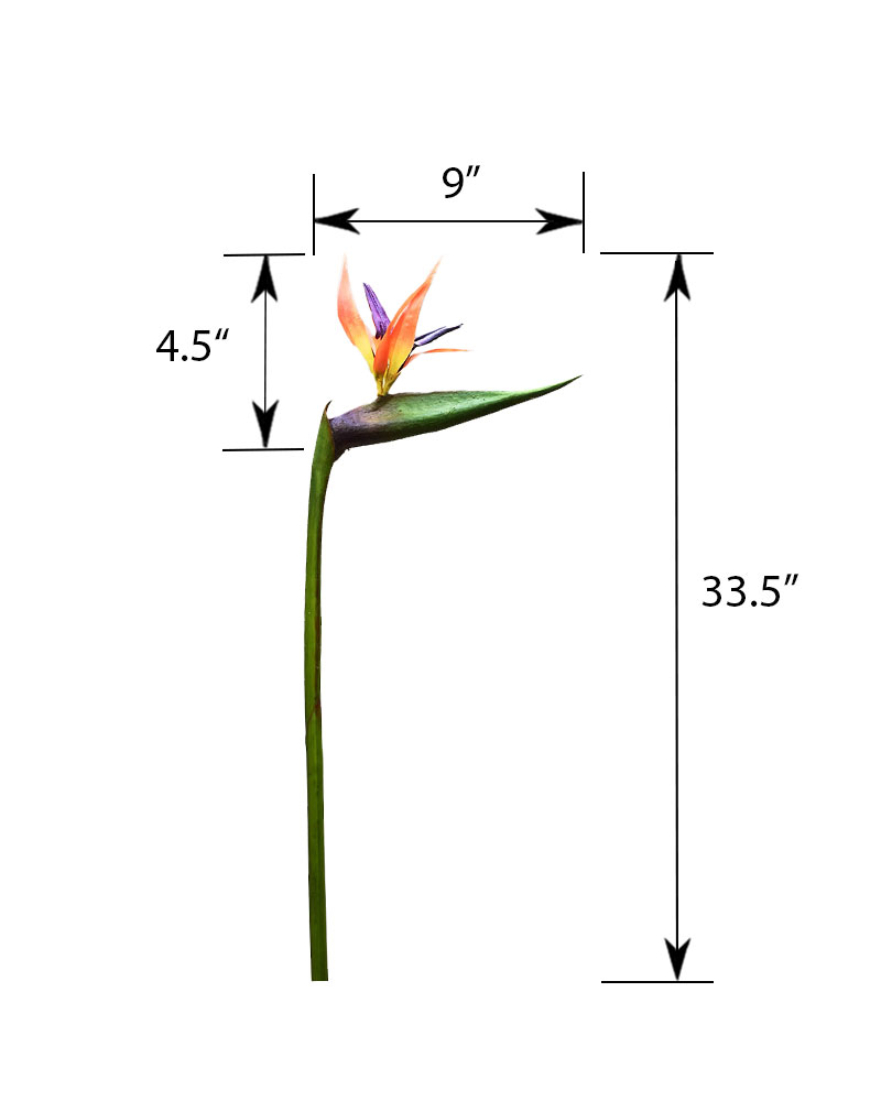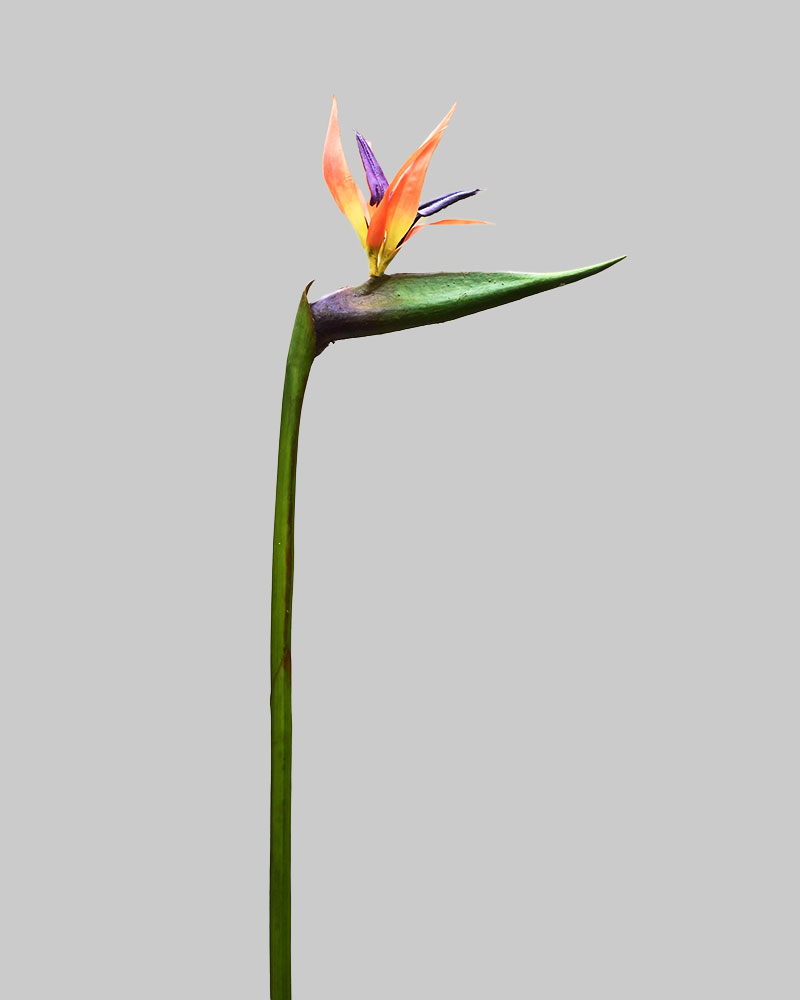 The Bird of Paradise boasts many unique features that make it a truly stunning flower. Its vibrant colours, striking shape, and impressive size give it an almost otherworldly appearance, perfectly capturing an exotic tropical vibe. This eye-catching stem, with its beautiful blend of green, orange, and purple hues, adds a dynamic splash of colour and elegance — sure to elevate any vase or arrangement and draw attention wherever it’s placed.