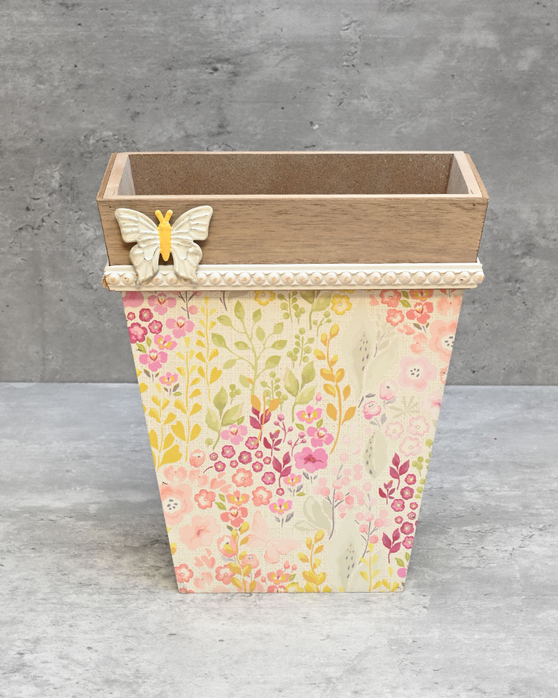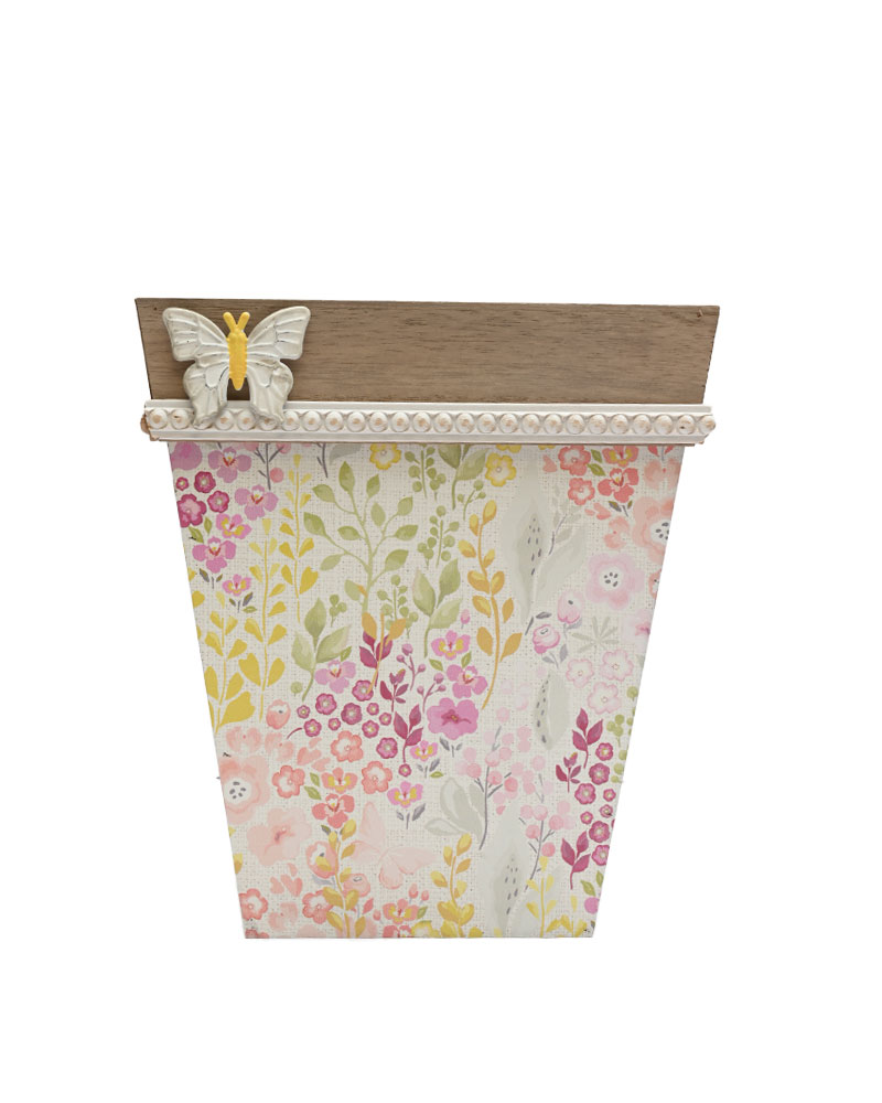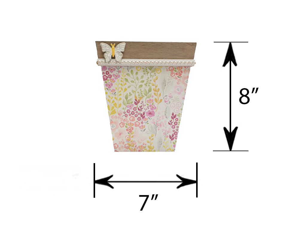 Bring a touch of spring charm to your home with this cheerful decorative container. Featuring a soft pastel floral pattern in pink, yellow, and green tones, it's perfect for adding a fresh and uplifting accent to any space. The natural wood trim along the top adds a rustic touch, while the delicate butterfly embellishment completes the look with whimsy and charm. Ideal for holding faux florals, greenery, or simply styled as a standalone piece, this container is a delightful way to brighten up your décor.