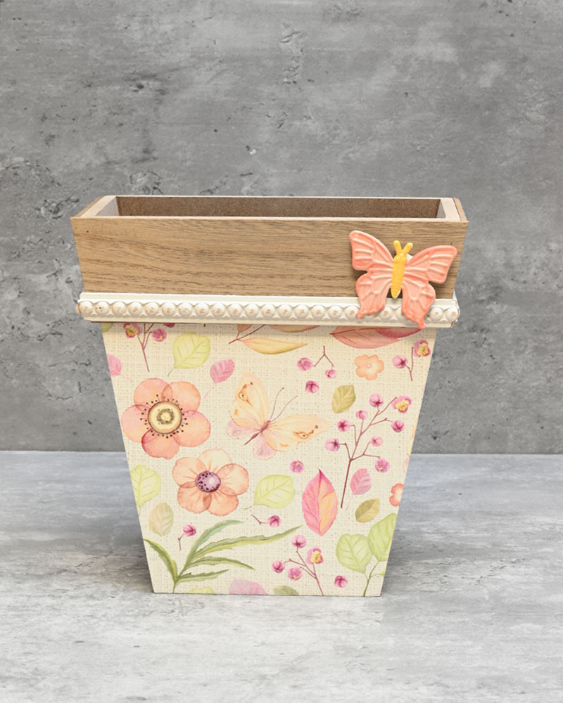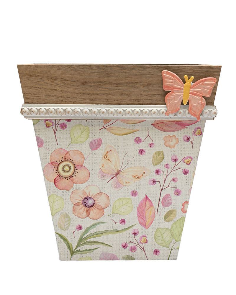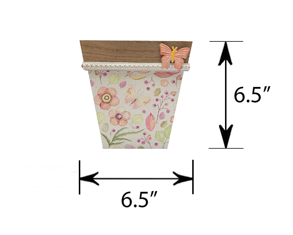Brighten up any space with this charming decorative wooden planter! This square-tapered container features a rustic natural wood top edge, trimmed with a delicate cream ribbon for added elegance. The lower section is beautifully adorned with a whimsical floral print in soft pinks, greens, and oranges, accented with butterflies and blooming flowers. A three-dimensional pink butterfly embellishment on the upper edge adds a playful touch of charm. Perfect for holding small potted plants, faux florals, or even as a decorative storage piece for your home or office.