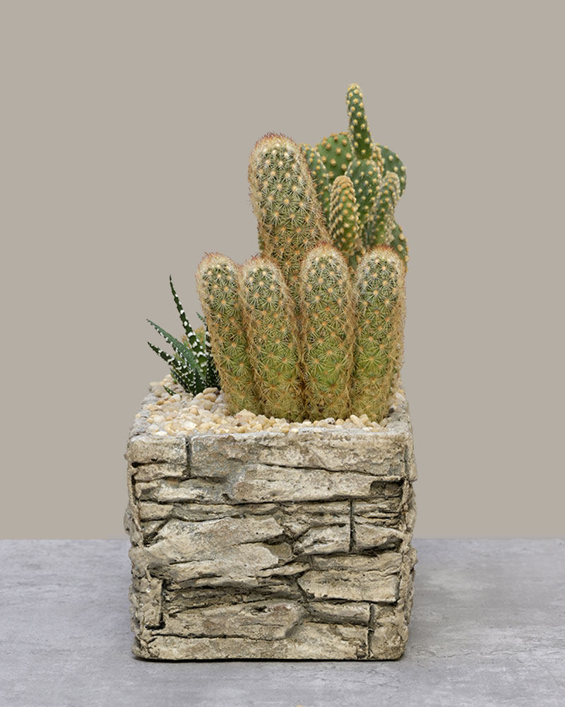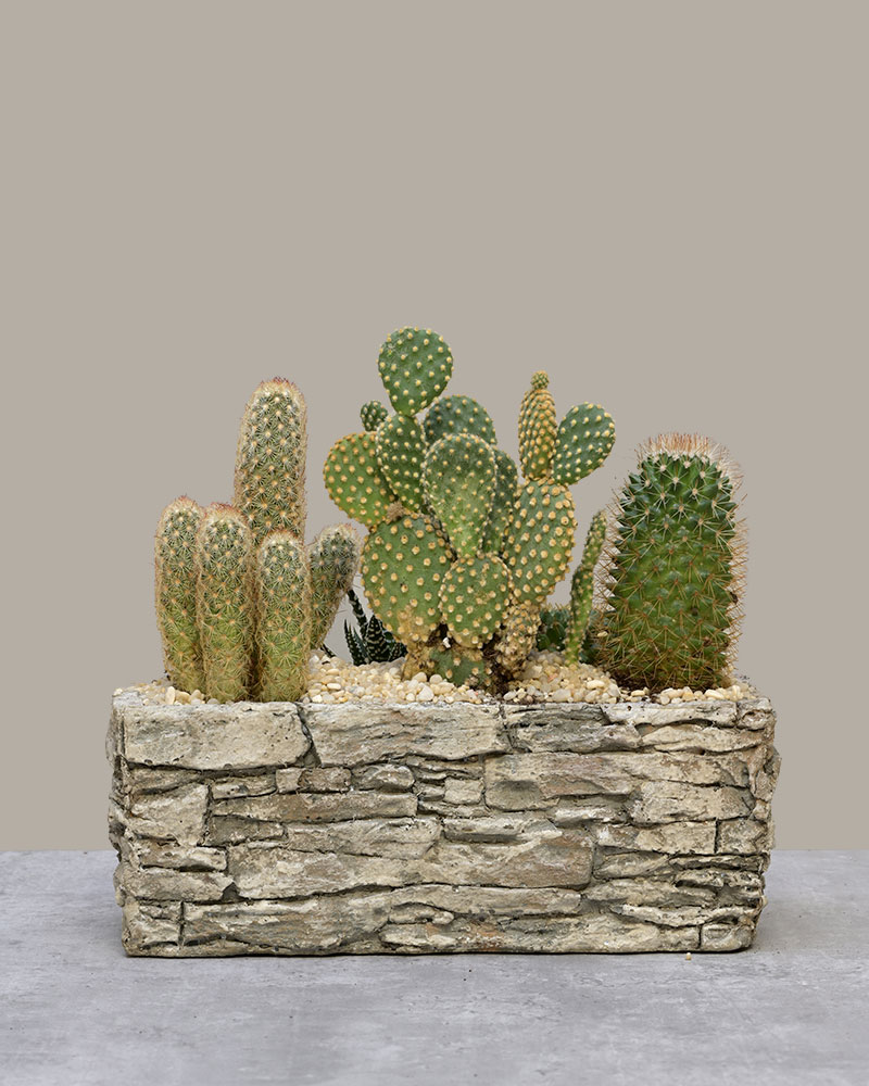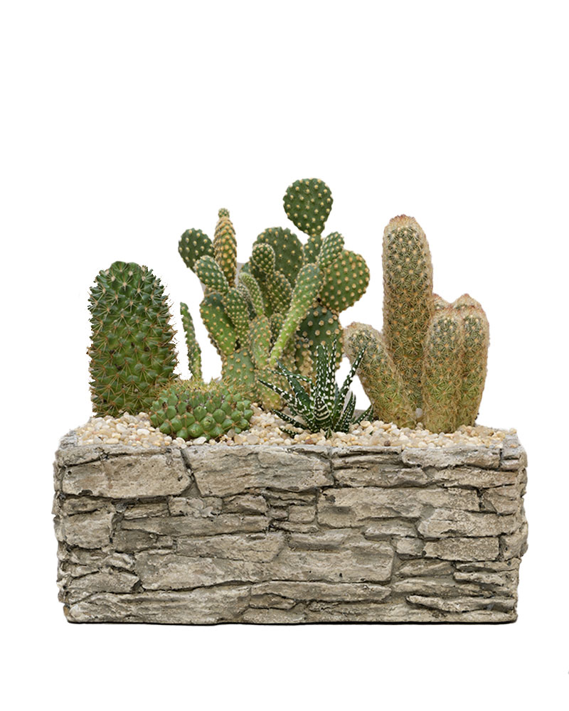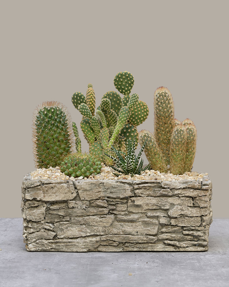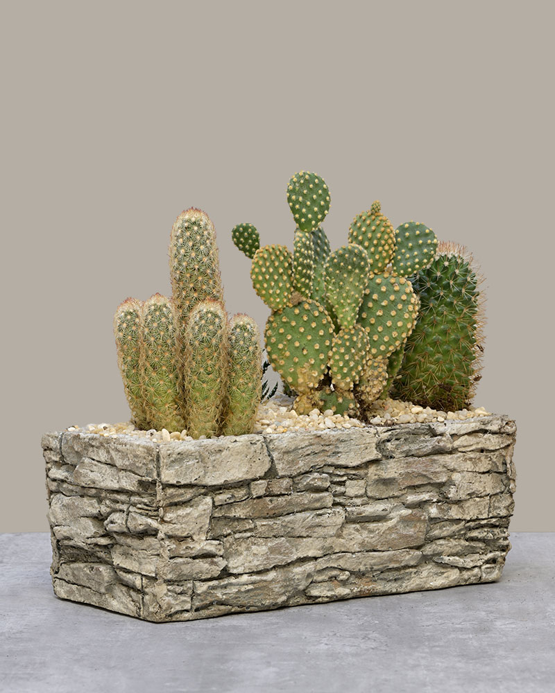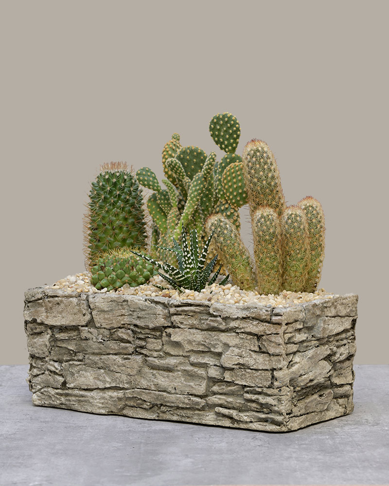 Sculptural, rugged, and full of desert charm - Cactus Canyon brings the beauty of the Southwest into your space. A curated collection of unique cacti varieties is planted in a stone-inspired trough, capturing the look and feel of a natural canyon landscape.