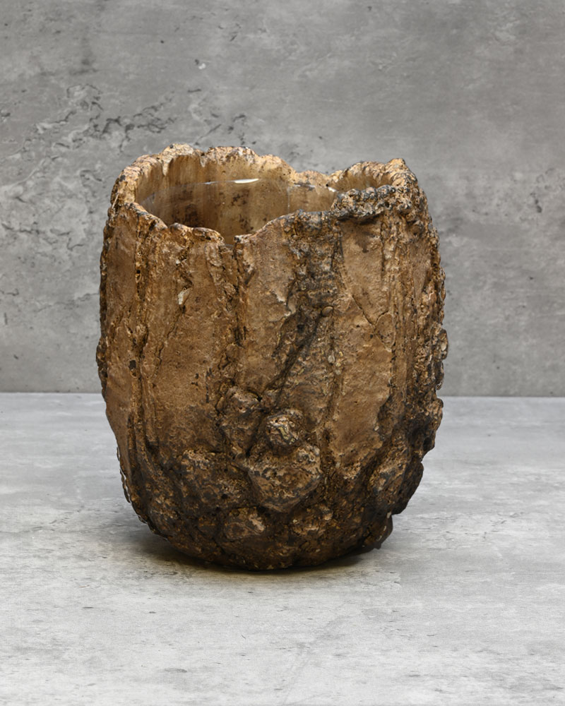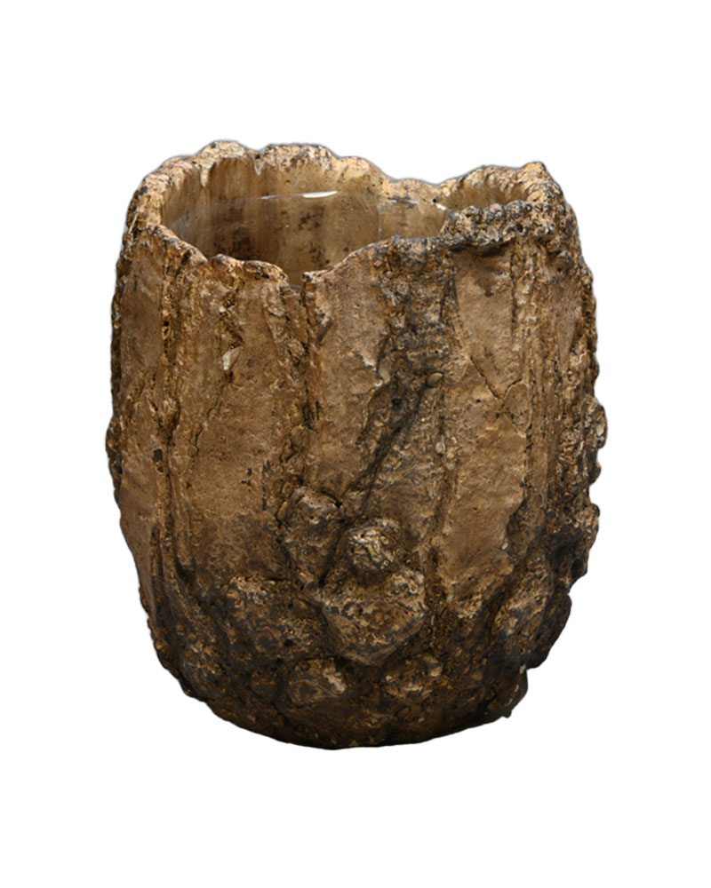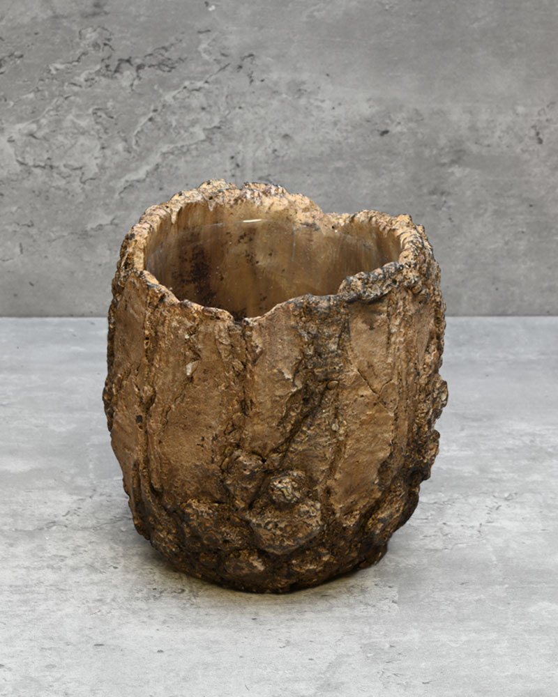 Featuring a rugged, bark-like surface and natural earthy tones, this handcrafted container brings organic warmth and tactile interest to any space. Ideal as a planter or decorative accent.