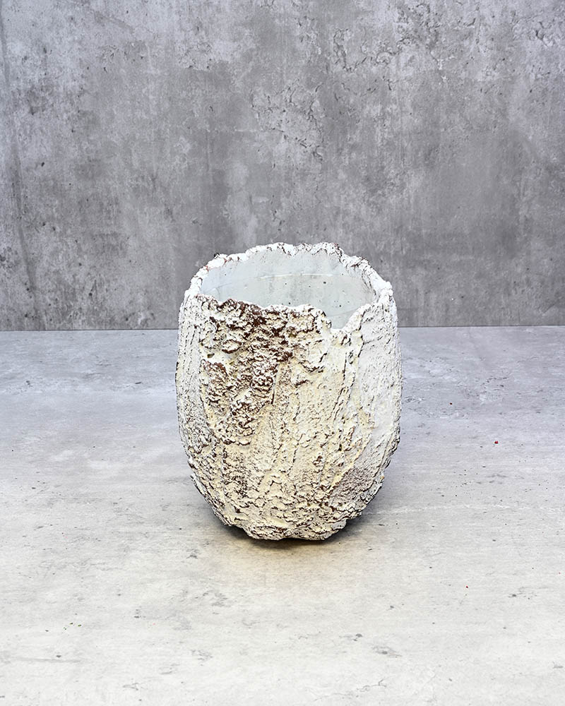 Featuring a rugged, bark-like surface and natural earthy tones, this handcrafted container brings organic warmth and tactile interest to any space. Ideal as a planter or decorative accent.