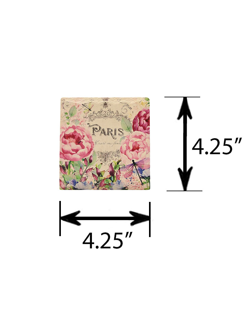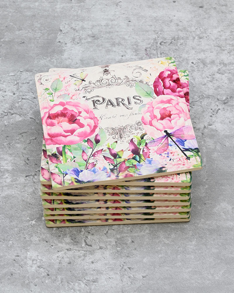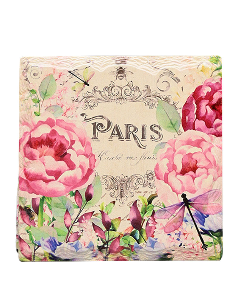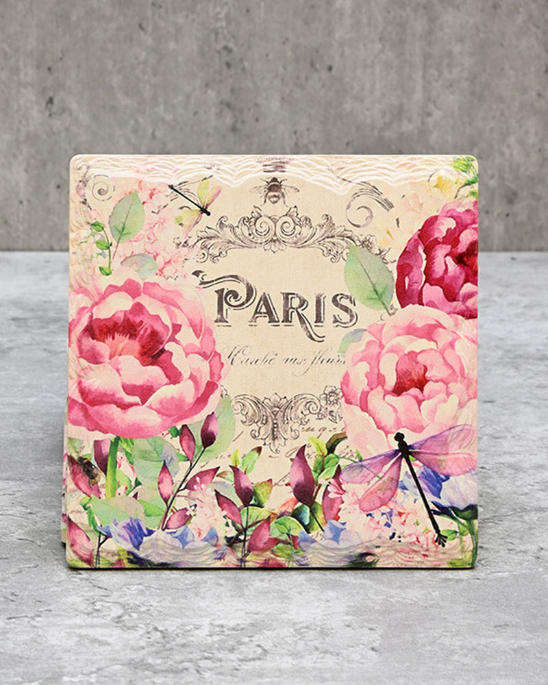 This classic-style coaster features a cork backing and a charming Paris-themed design, making it a perfect addition to any table or surface. The bevelled edges and large pink peonies add a timeless and elegant touch, bringing a hint of romance and sophistication to your décor.