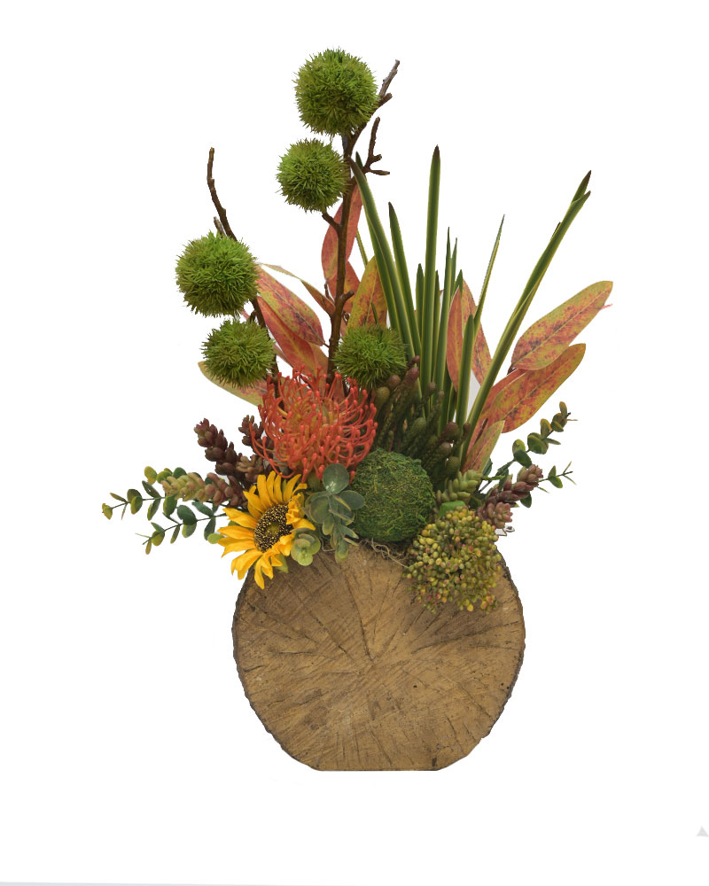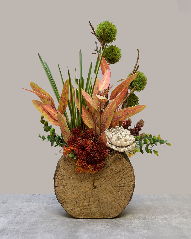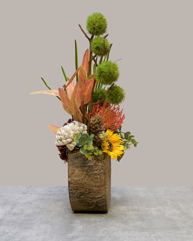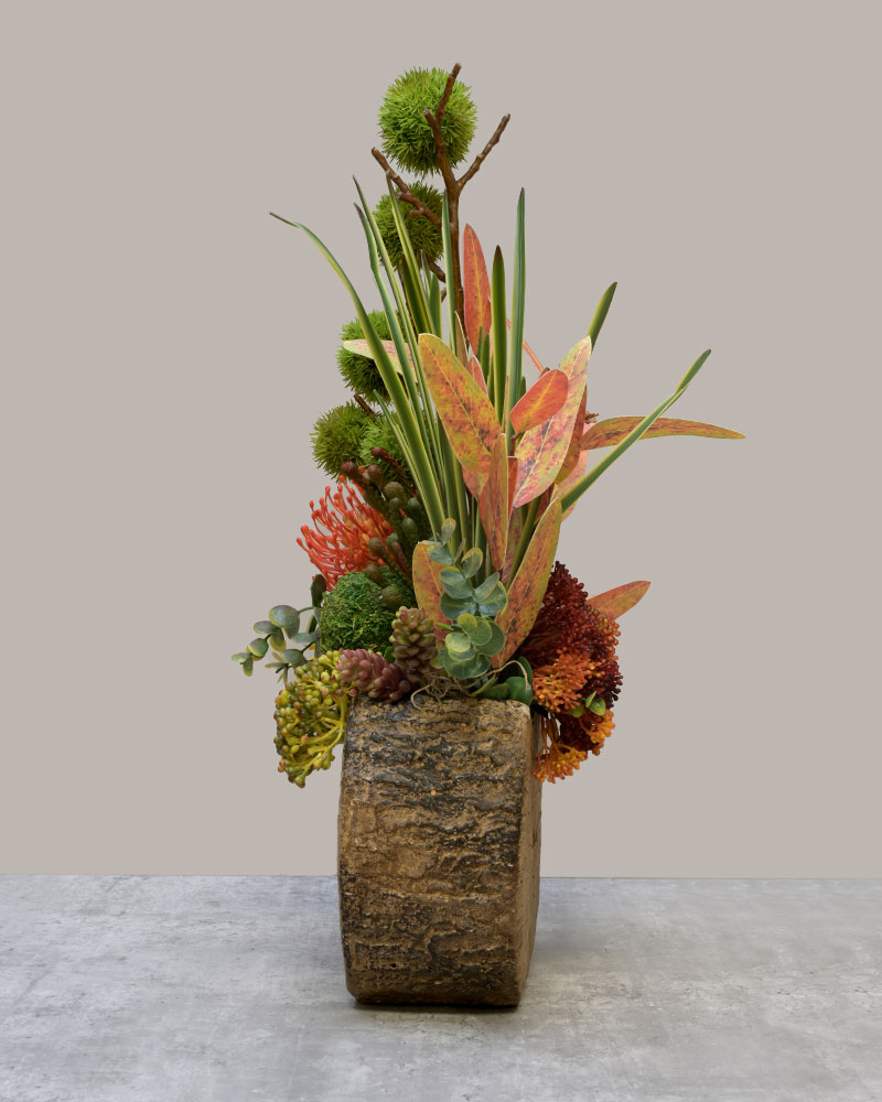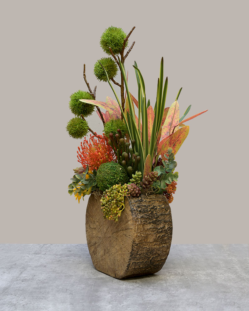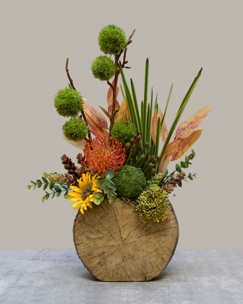 This striking artificial arrangement captures the essence of autumn with its bold textures and vibrant colours. Set in a rustic, wood-look base, it features lifelike green moss orbs, fiery orange pincushion blooms, golden sunflower accents, and multi-toned foliage in shades of red and gold. Tall greenery and sculptural branches add height and drama, creating a natural yet modern display. Perfect for bringing seasonal warmth into your home décor, this arrangement offers a lasting touch of fall beauty without the upkeep of fresh flowers.