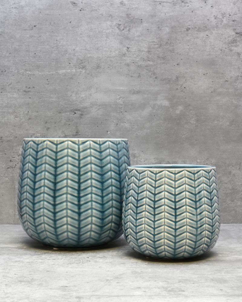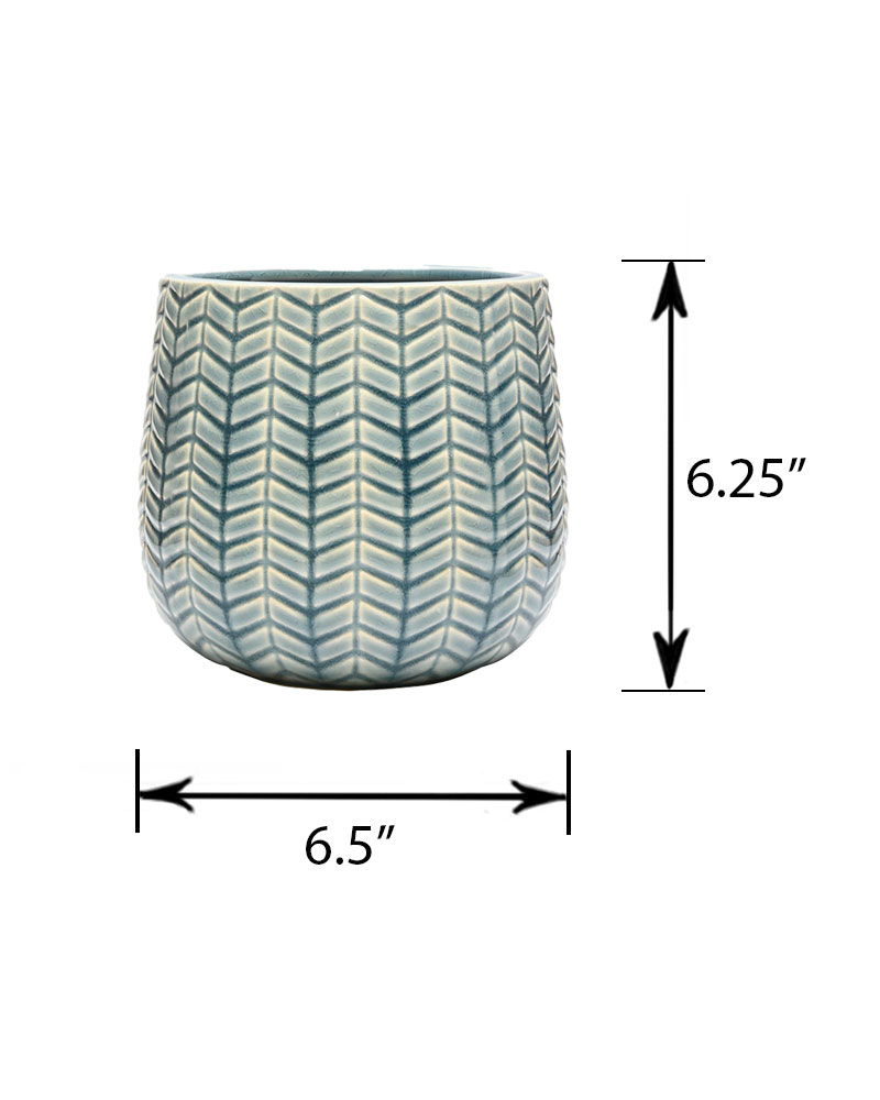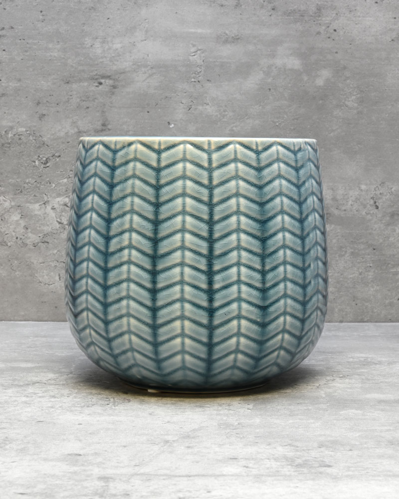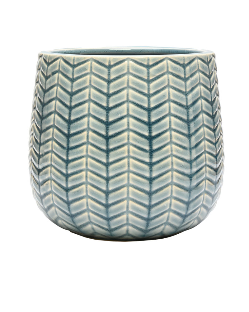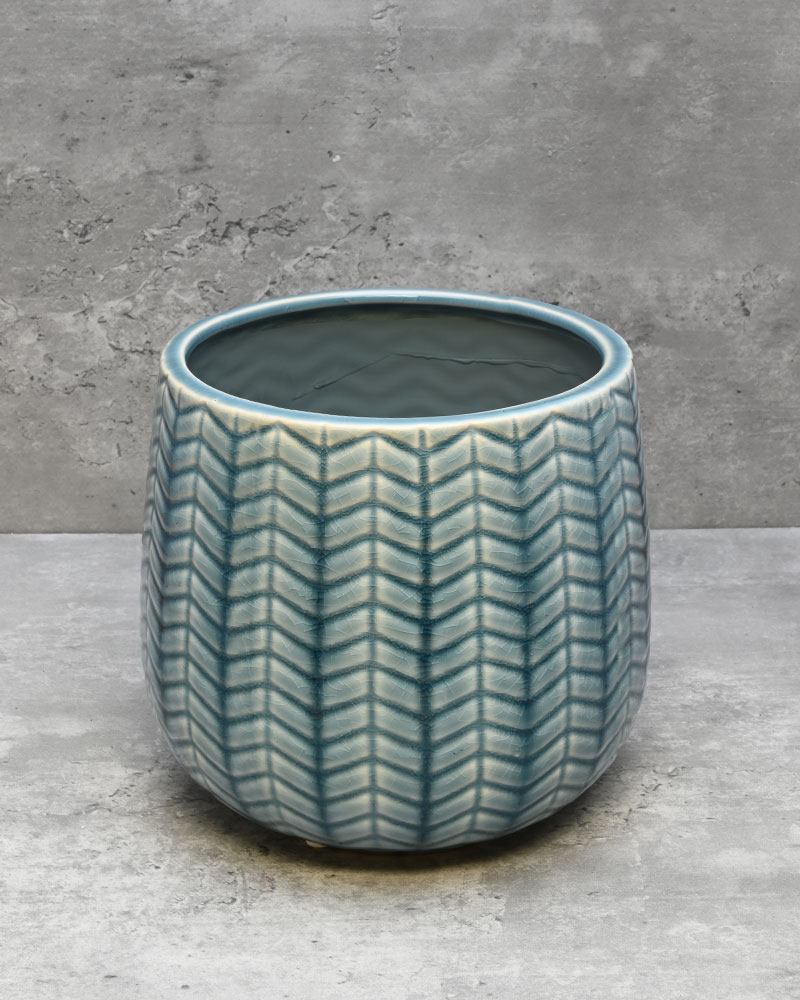 A beautiful blend of blue and white hues highlights the chevron embossed pattern on this container, creating a striking and elegant design. Its textured finish adds depth and character, making it a standout piece in any setting. Whether displayed alone as a decorative accent or filled with vibrant flowers, this container effortlessly brightens and enlivens any room with its fresh and charming appeal.