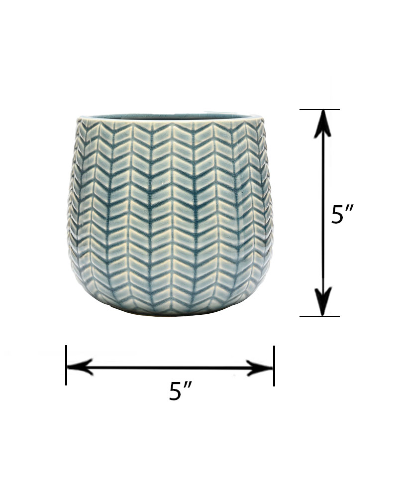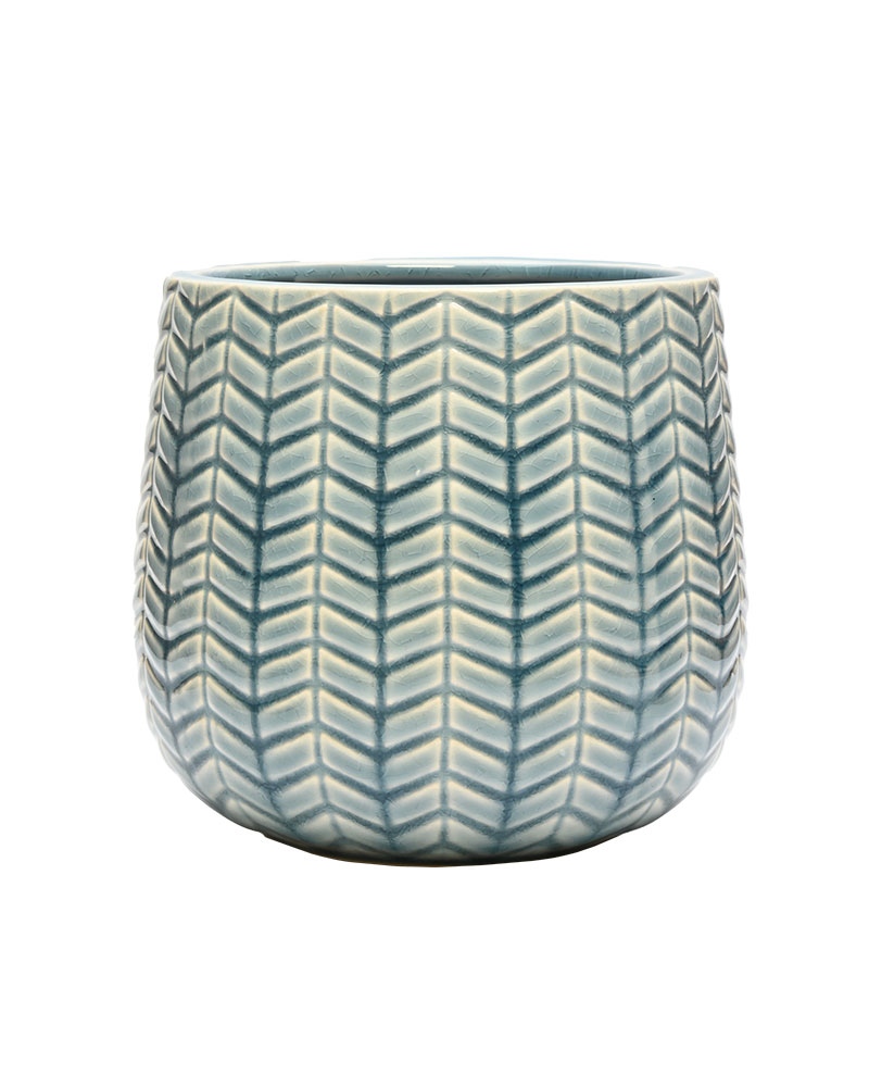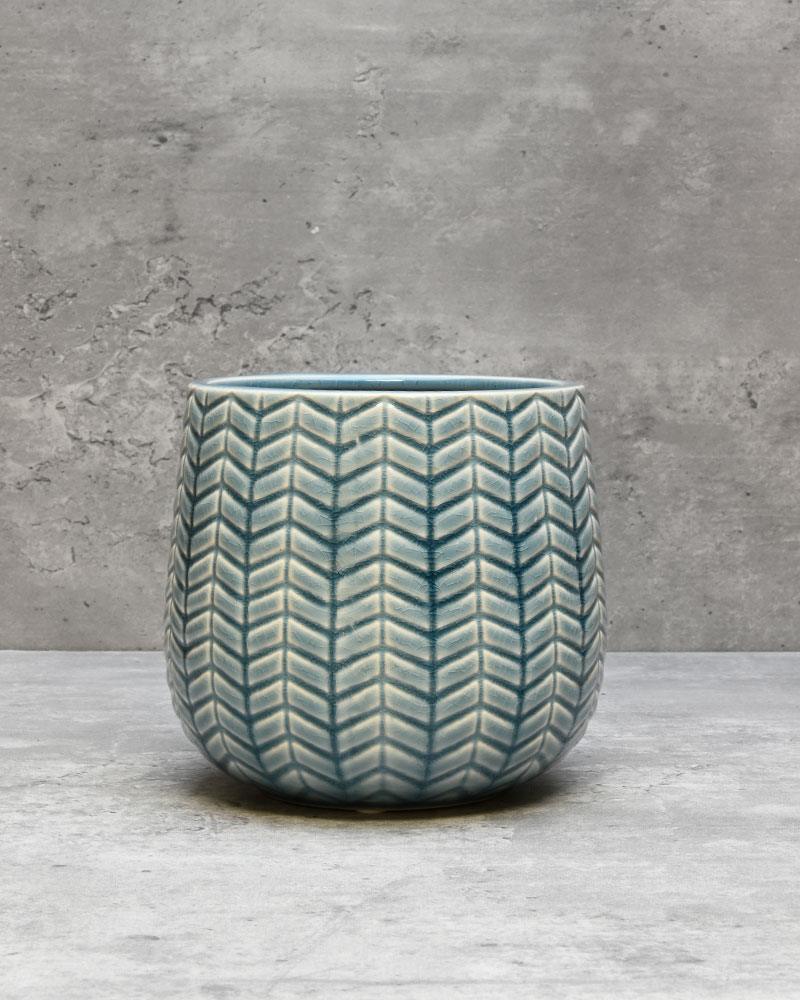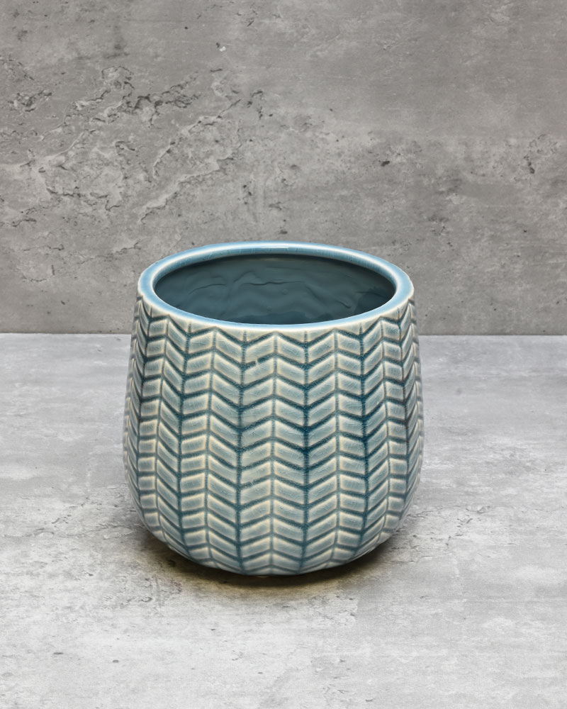 A beautiful blend of blue and white hues highlights the chevron embossed pattern on this container, creating a striking and elegant design. Its textured finish adds depth and character, making it a standout piece in any setting. Whether displayed alone as a decorative accent or filled with vibrant flowers, this container effortlessly brightens and enlivens any room with its fresh and charming appeal.