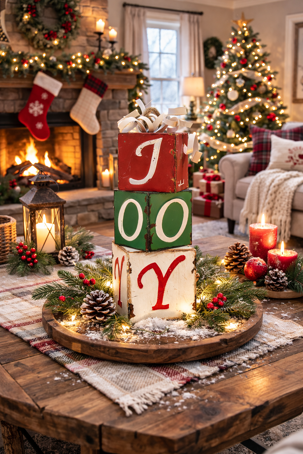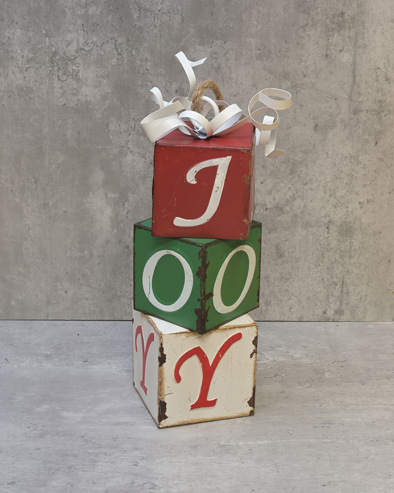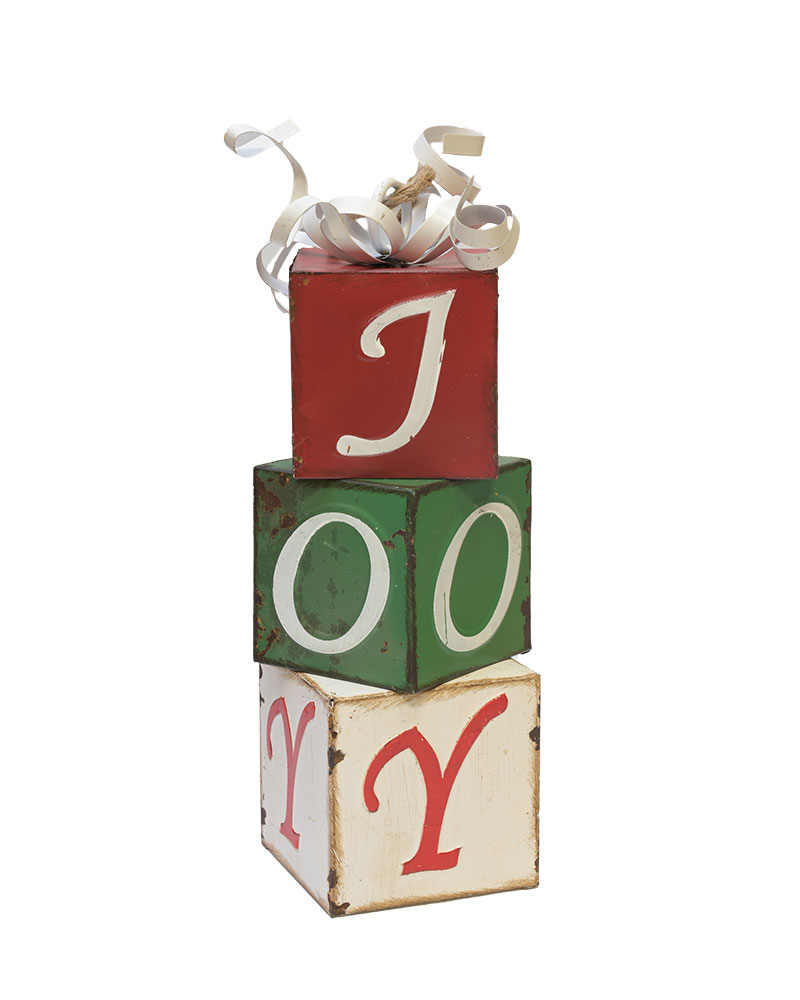 This festive metal décor features three stacked blocks spelling out "JOY," each crafted with a rustic, distressed finish in classic holiday colours. Topped with curled metal ribbons for a playful touch, this charming piece adds a nostalgic, farmhouse-style feel to mantels, tabletops, and entryway displays. Durable and eye-catching, it brings warmth and cheer to any seasonal setting.