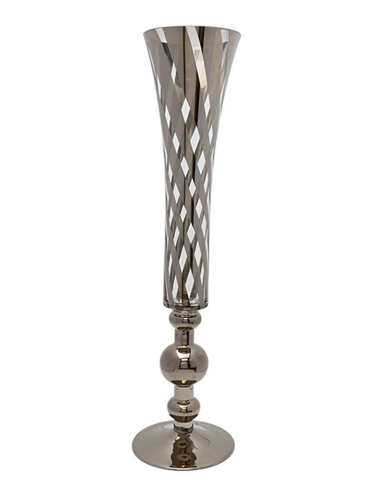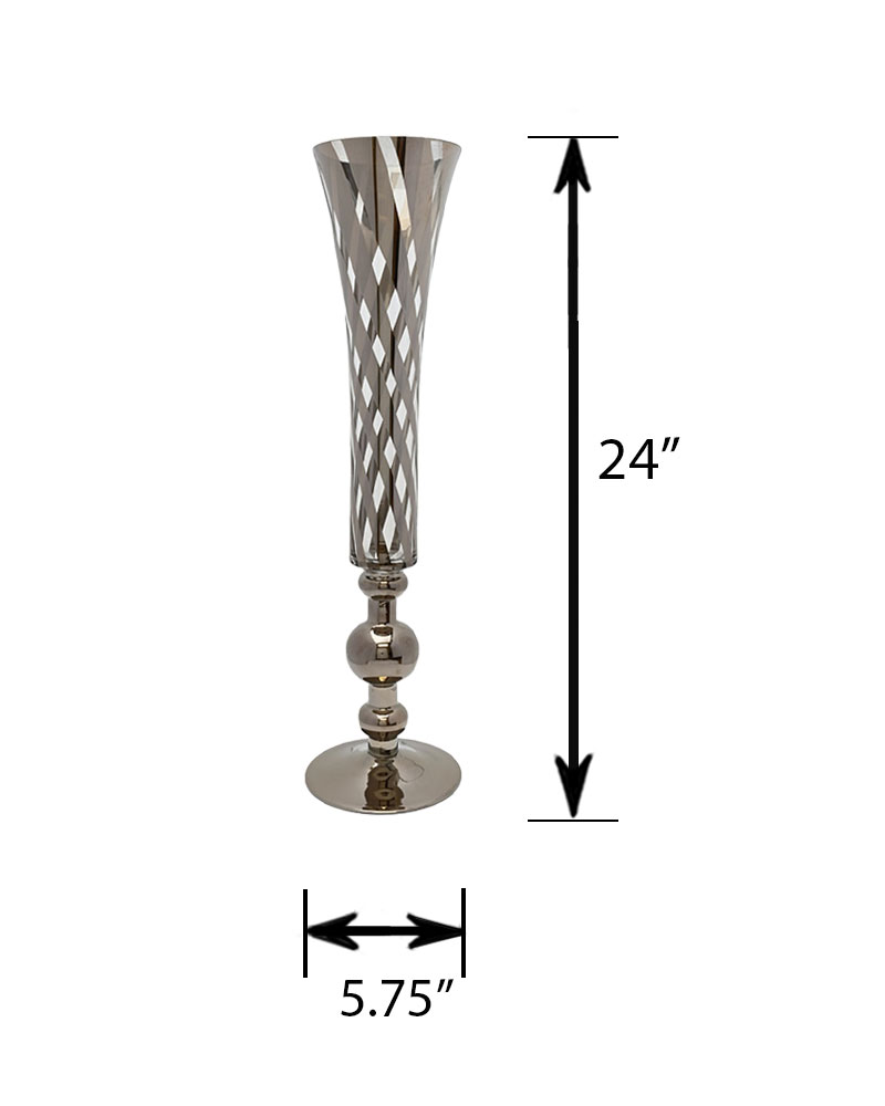 This clear glass vase features a striking silver stripe pattern that adds depth and visual interest to its unique shape. The mix of transparent glass and reflective silver creates a modern, elegant look. Perfect for fresh or faux florals, or as a standalone accent, it adds a sophisticated touch to any décor style.