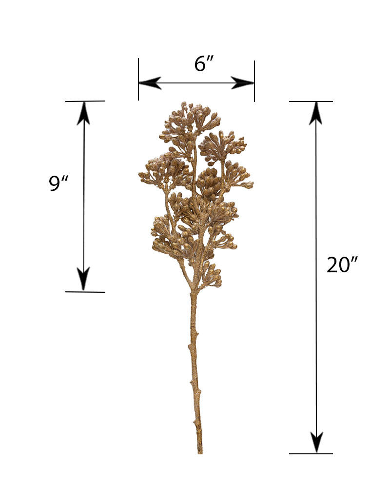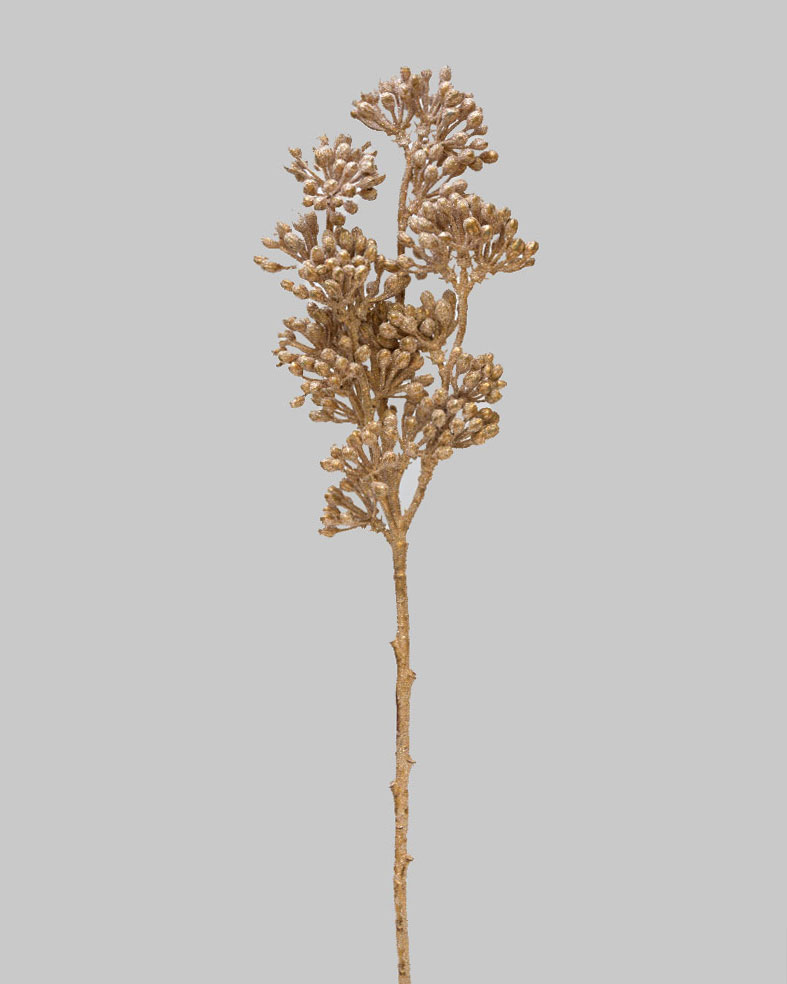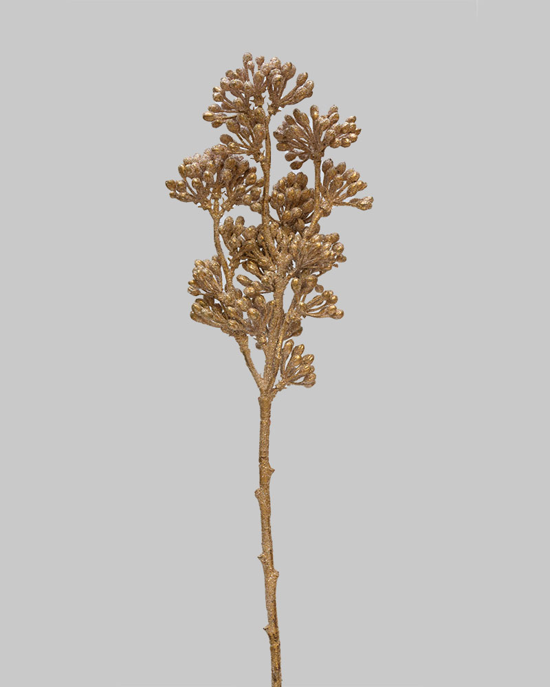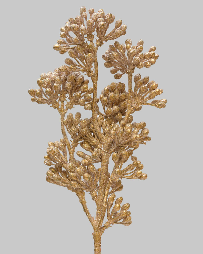 This glittered cluster berry spray brings a touch of festive glamour to your holiday décor. Featuring golden berry clusters with a sparkling finish, it catches the light beautifully and adds warmth to any arrangement. The intricate branching and textured berries create a rich, dimensional look that complements both traditional and modern seasonal designs. Perfect for enhancing wreaths, garlands, centrepieces, or tree decorations, this stem adds a radiant touch of holiday elegance and cheer.