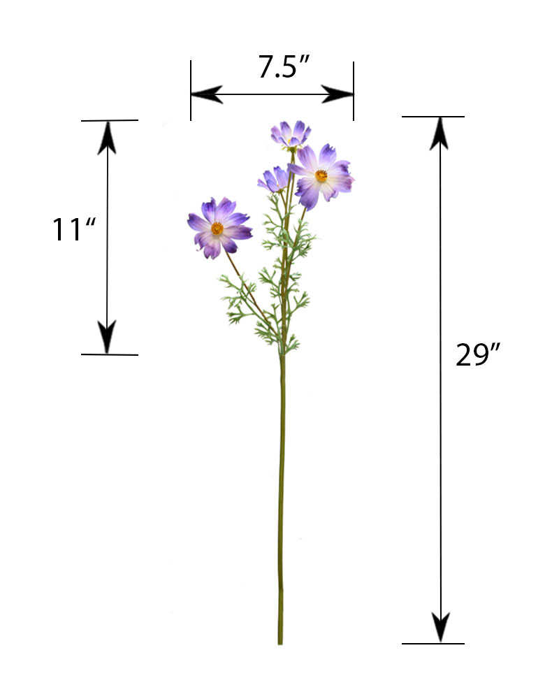 Cosmos are dainty, daisy-like flowers that brighten gardens all summer with their soft beauty. Known for their delicate leaves and sturdy stems, they produce vibrant blooms full of colour and charm. This artificial stem mirrors that natural elegance with incredible detail. Featuring multiple purple flowers with a gentle, realistic texture, it not only looks real but feels real too. Part of our Natural Touch lineup, these lifelike Cosmos are perfect for adding a subtle splash of colour and character to any arrangement.