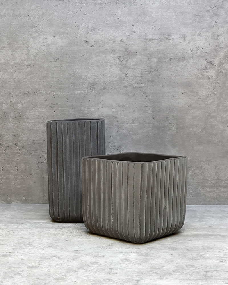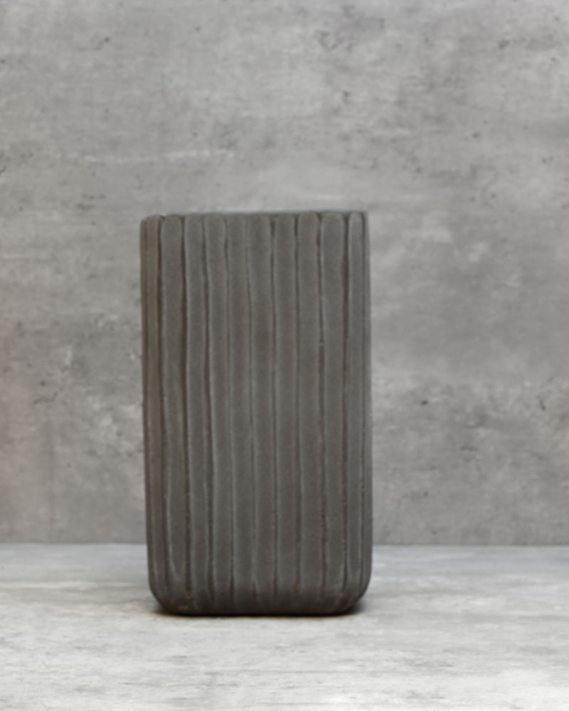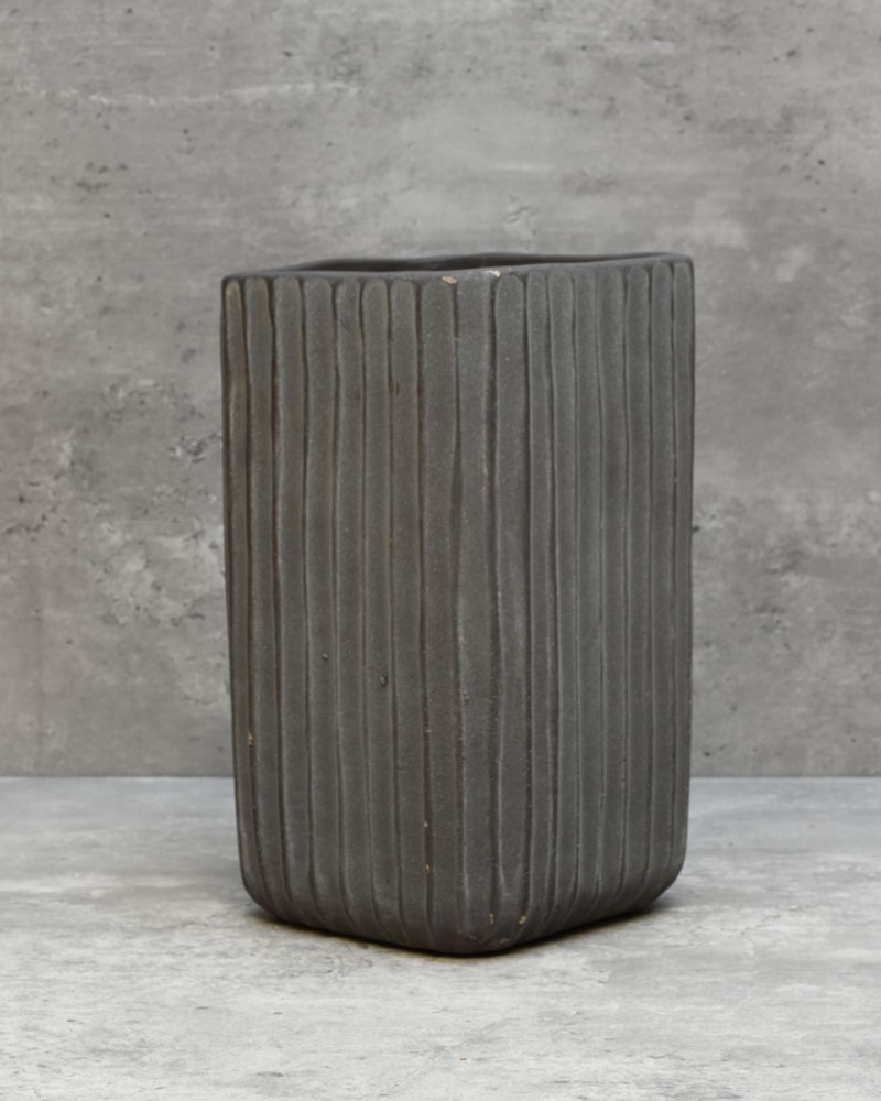 With its tall, ridged form and deep grey-mauve colour, this container adds depth and drama to any arrangement. If you're aiming for a dark, lush look, this just might be the perfect choice.