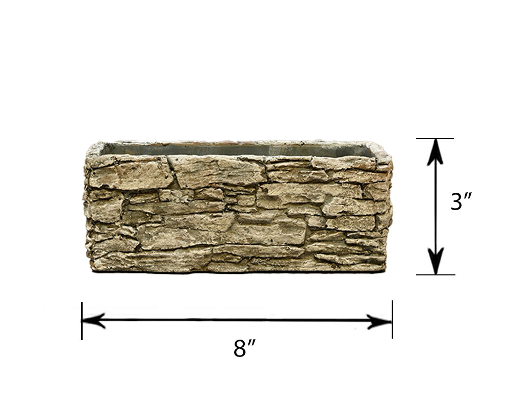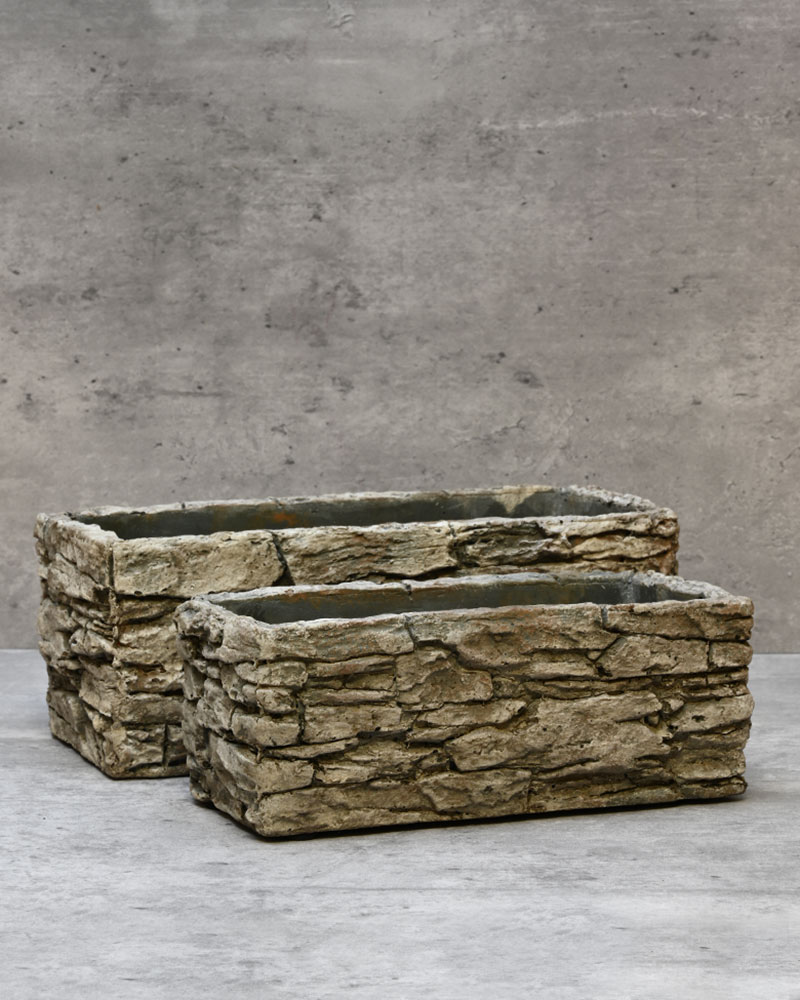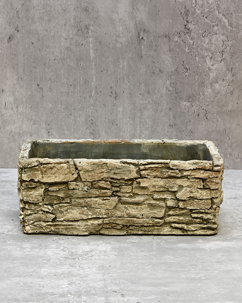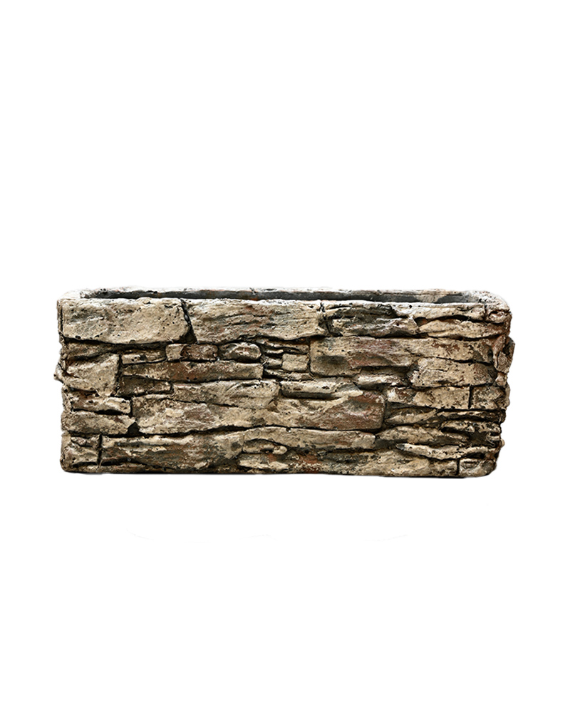 This stone-stacked rectangular container commands attention with its bold, architectural presence. The carefully blended shades of brown, black, and grey create a natural cobblestone effect that adds texture and depth to any space. Perfect for showcasing lush greenery, vibrant flowers, or minimalist succulents, this planter brings a rugged yet refined touch to your décor.
