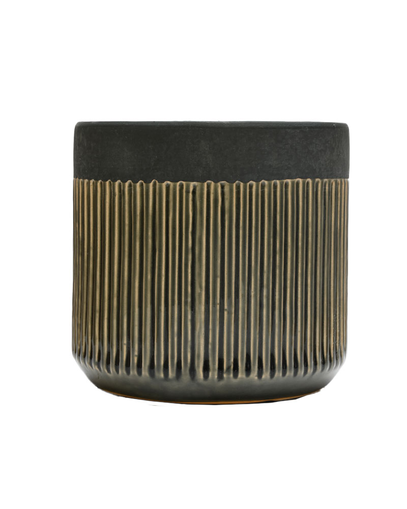This simple round container features a ribbed textured finish with alternating shades of grey and taupe, all wrapped in a soft matte finish. Its neutral tones and subtle design make it a versatile piece that complements a wide range of décor styles.