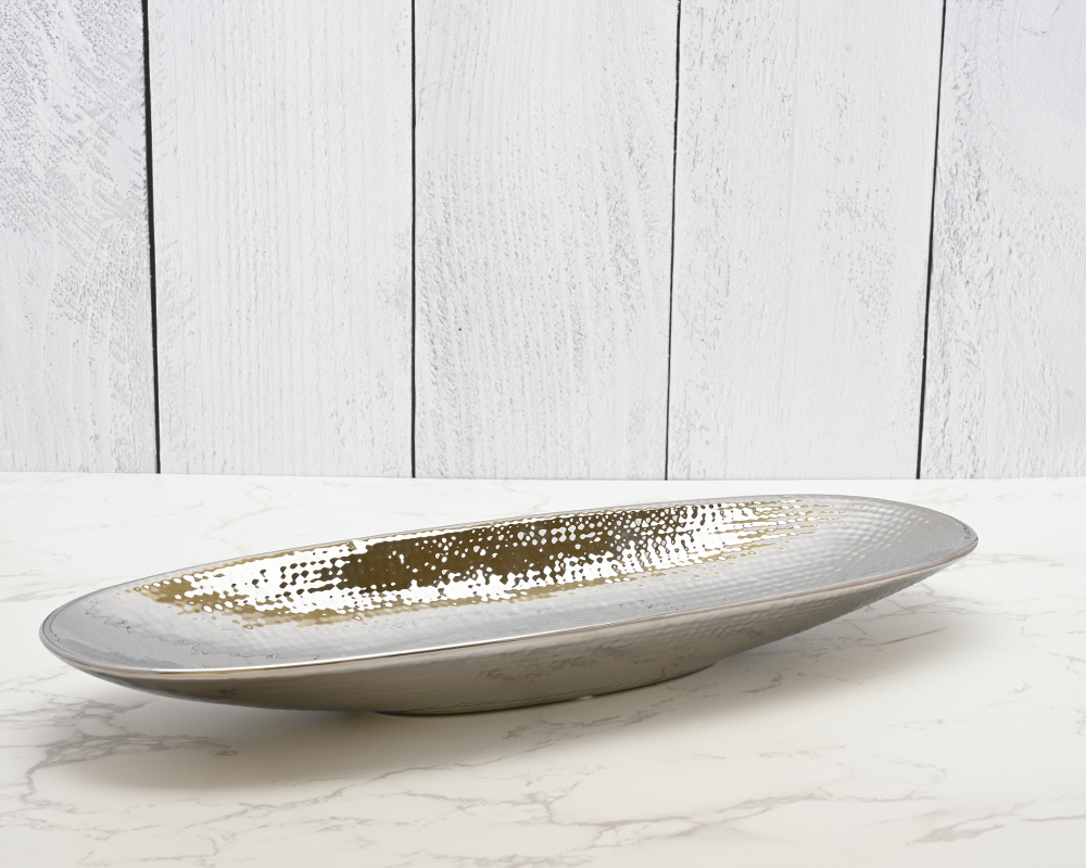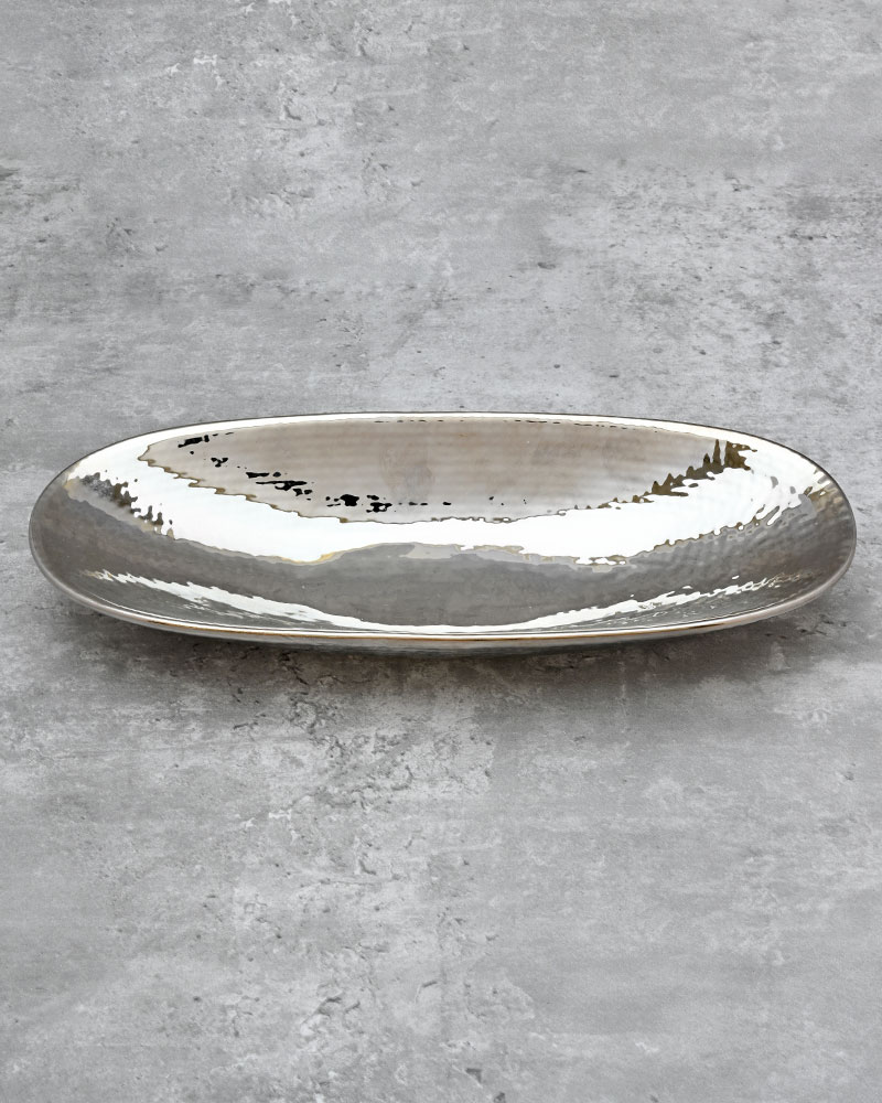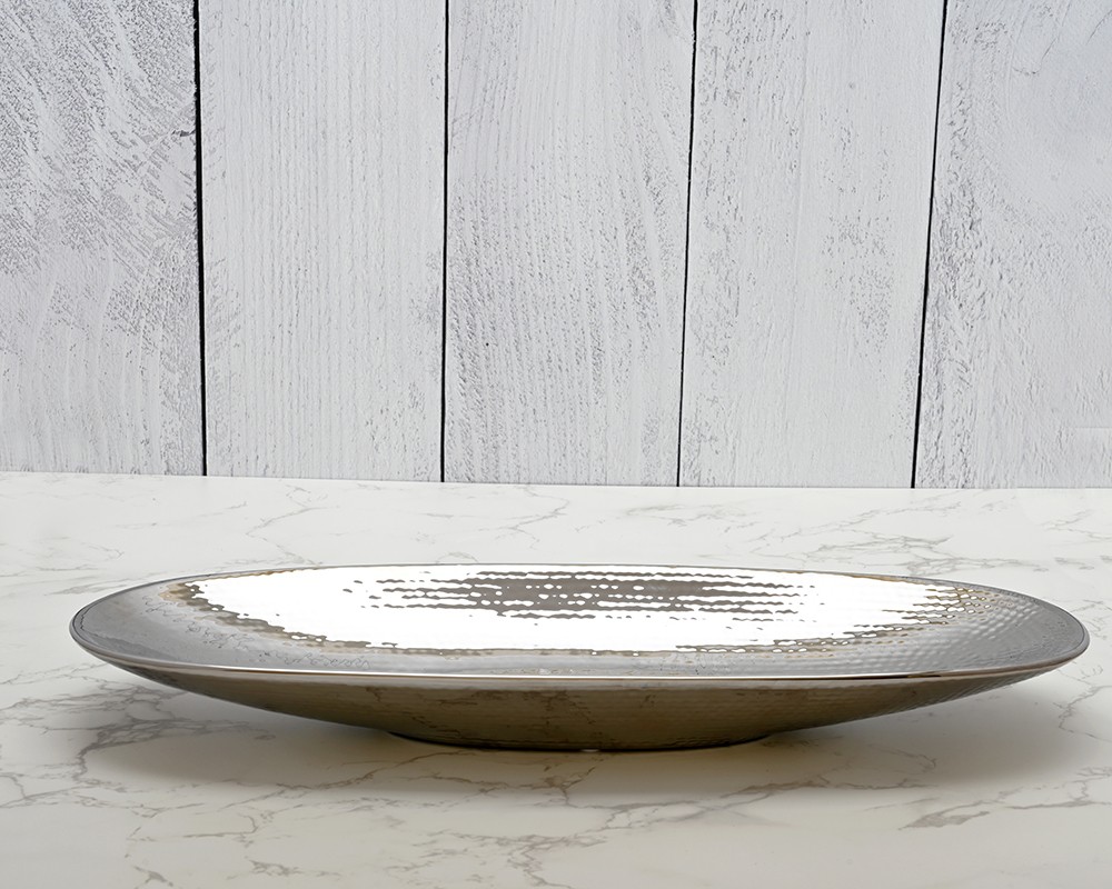Featuring a dimpled, hammered texture and a polished chrome finish, this platter is a striking addition to any table or shelf. Its reflective surface and modern design make it a versatile accent piece that adds style and sophistication to any room in the home.