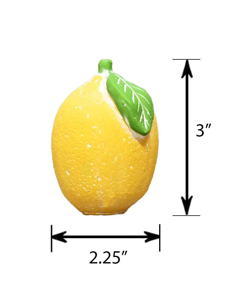 This charming little lemon is a delightful decorative accent that adds a fresh, vibrant touch to any shelf, mantel, or tabletop. Its bright yellow colour and realistic details bring a natural pop of zest, brightening up your space. Perfect for adding a cheerful vibe, this small piece works well in kitchens, living rooms, or any area that needs a subtle burst of freshness. Use it alone or with other decorative items to enhance your home’s décor.