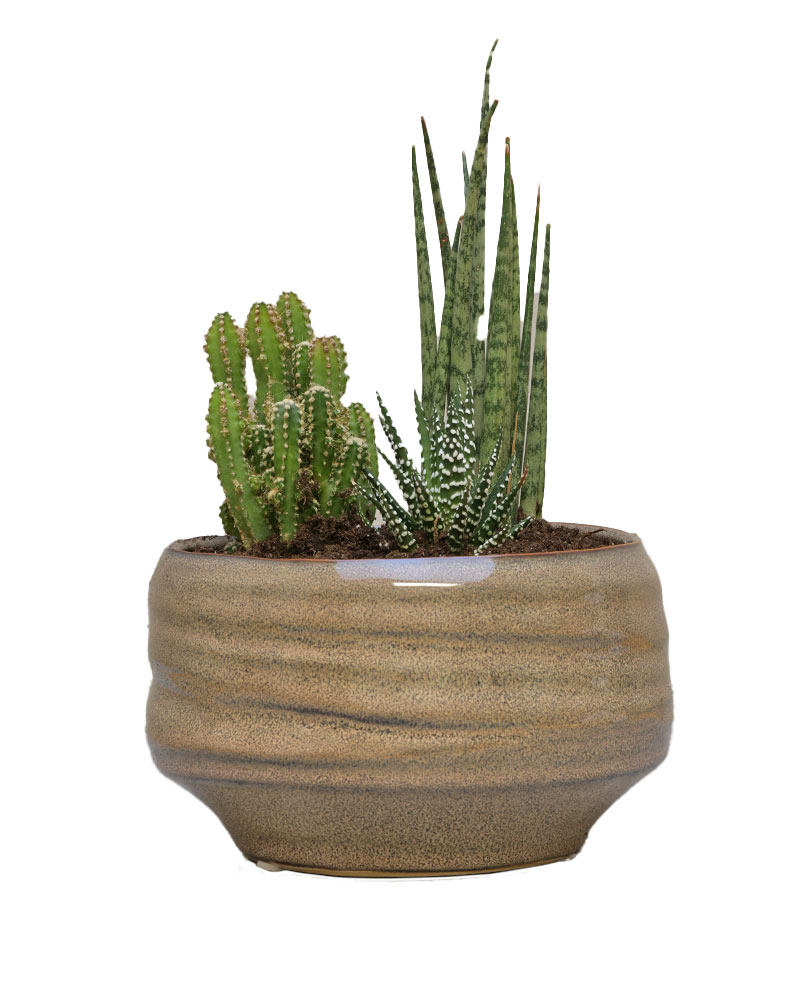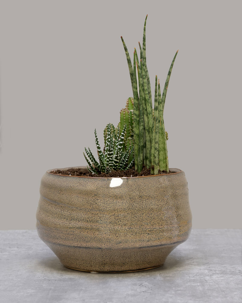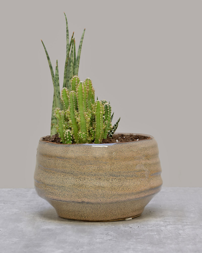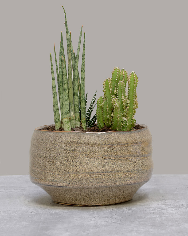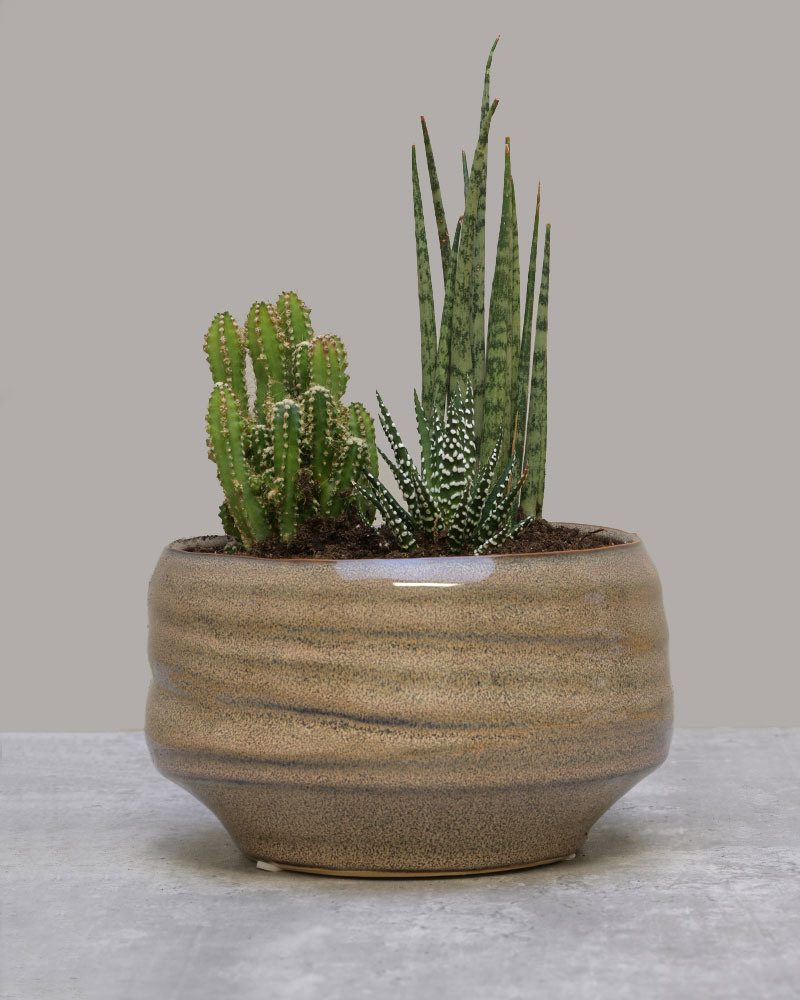 Clean, sculptural, and full of character, Desert Trio captures the calm simplicity of desert landscapes. A trio of striking succulents in varied shapes and textures rises from a smooth, sand-toned ceramic planter, creating a balanced and modern display. The warm tones and natural form make it a timeless piece that brings subtle sophistication to any setting. Perfect for modern interiors, office spaces, or minimalist décor, Desert Trio adds a touch of nature that feels both grounded and refined.