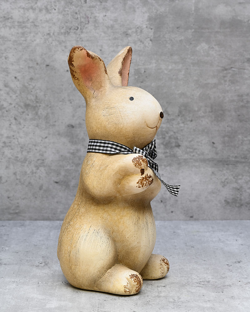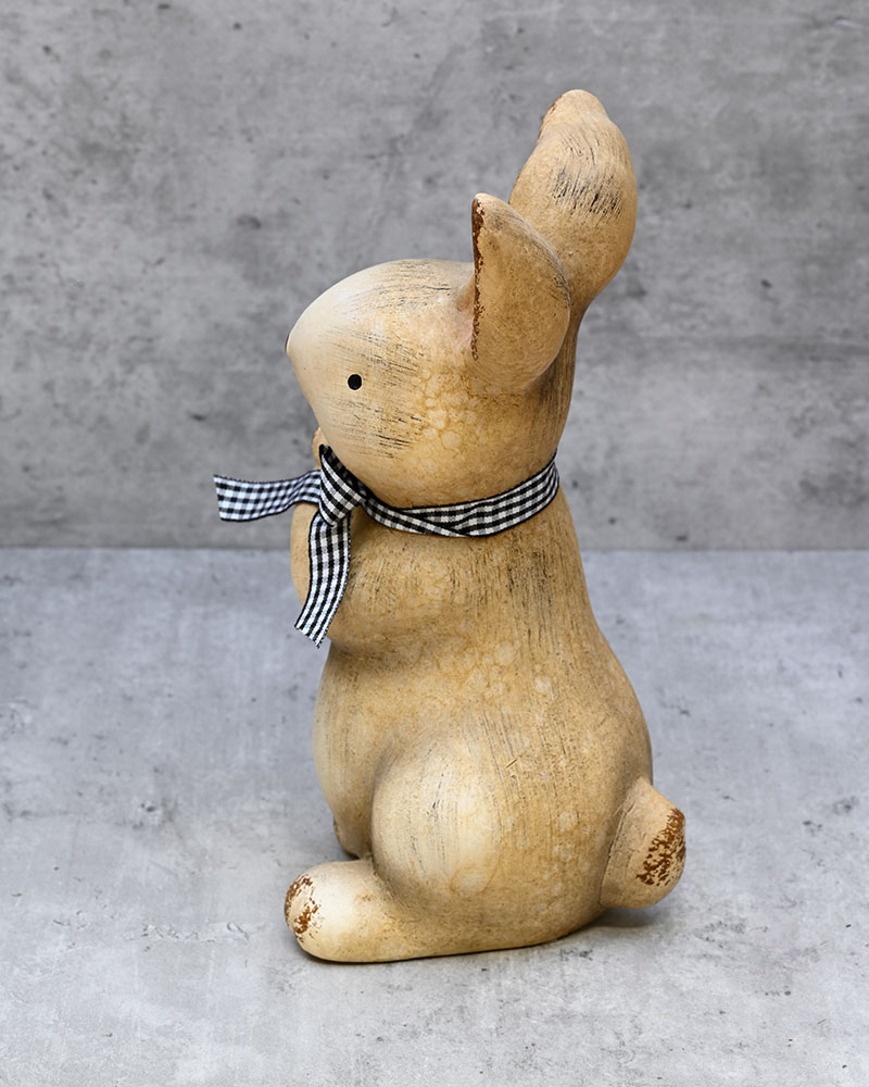 Bring a touch of farmhouse charm to your spring décor with this rustic bunny figurine. Crafted with a weathered, stone-like finish and accented with a black-and-white gingham bow, this sweet bunny is perfect for Easter displays or year-round country-style decorating. Its warm tones and endearing design make it a delightful addition to mantels, shelves, or table centrepieces.