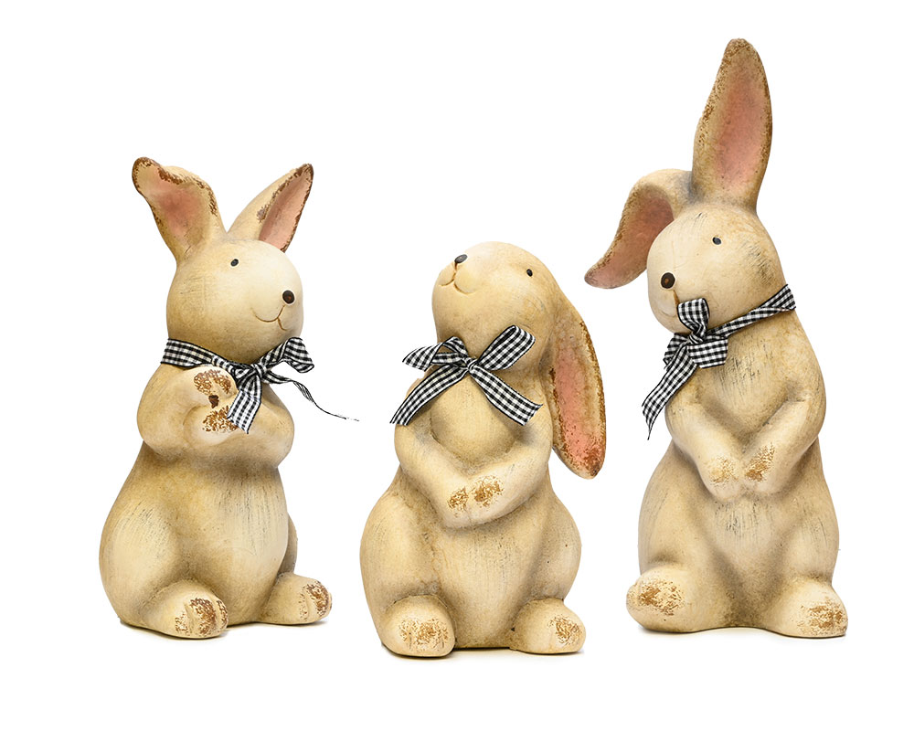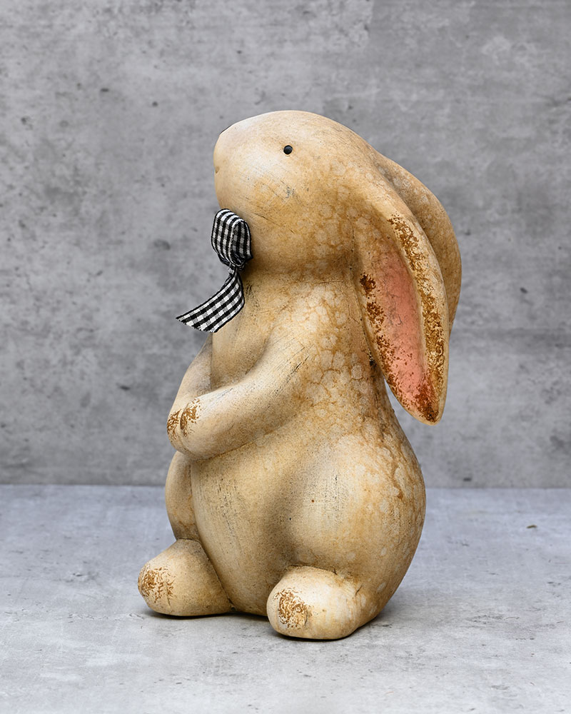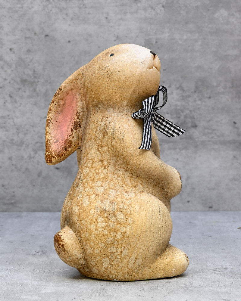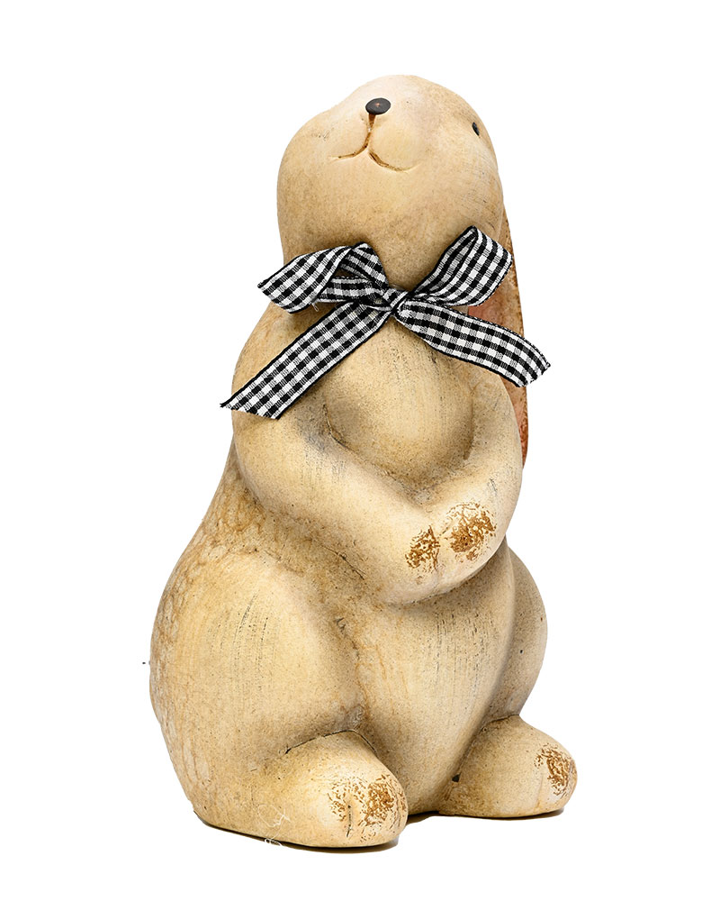 Bring a touch of farmhouse charm to your spring décor with this rustic bunny figurine. Crafted with a weathered, stone-like finish and accented with a black-and-white gingham bow, this sweet bunny is perfect for Easter displays or year-round country-style decorating. Its warm tones and endearing design make it a delightful addition to mantels, shelves, or table centrepieces.