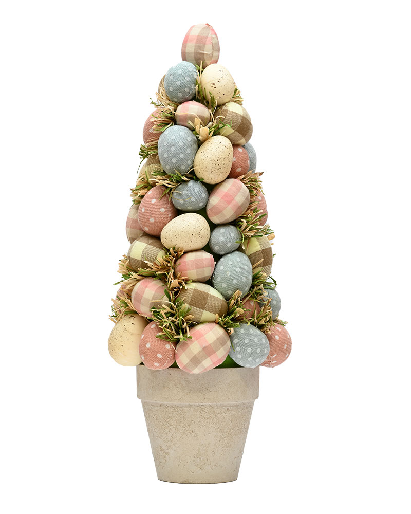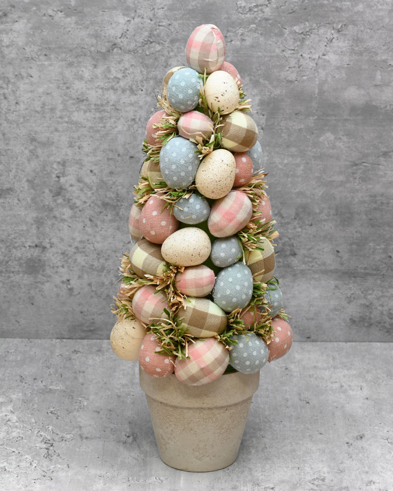 Add a charming touch to your spring décor with this whimsical Easter Egg tree, artfully crafted from an assortment of pastel fabric eggs in plaid, polka dot, and solid patterns. Nestled with sprigs of faux grass for a fresh, natural look, the arrangement sits in a rustic pot for easy display. Perfect for tabletops, mantels, or entryways, this piece brings a cozy farmhouse feel to your Easter celebrations.