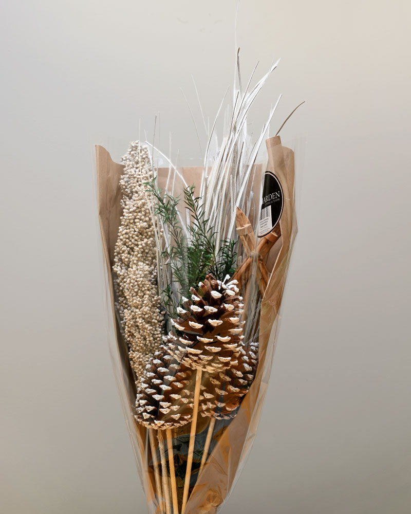 All the traditional winter colours come together in this classic dried bouquet, perfect for bringing holiday cheer to your home year after year. Featuring large snow-tipped pinecones, natural branches, and a mix of decorative elements, this arrangement adds a warm, seasonal touch to any vase or container. Timeless and festive, it’s the perfect way to celebrate the winter season in style.