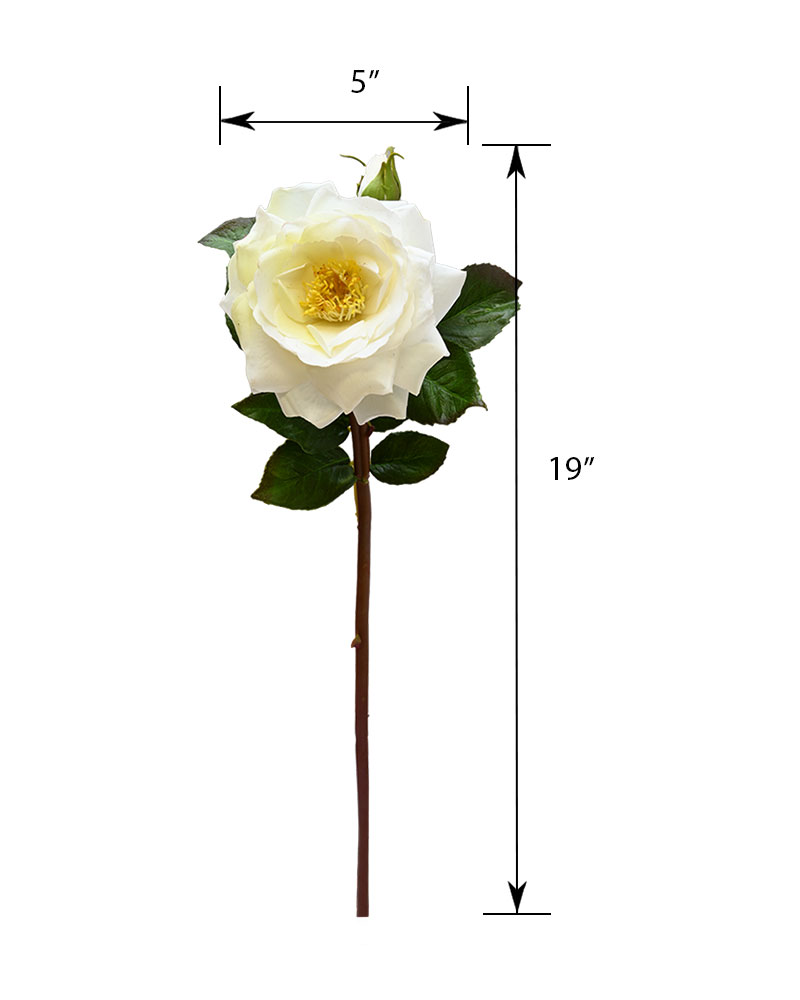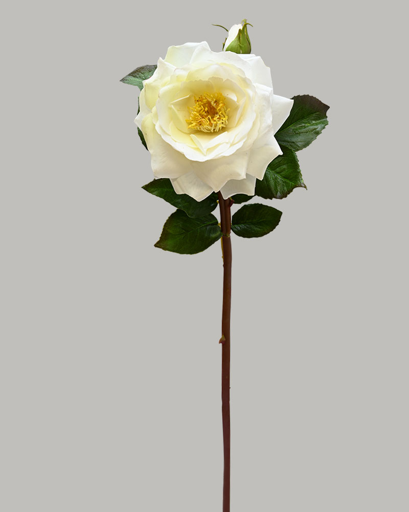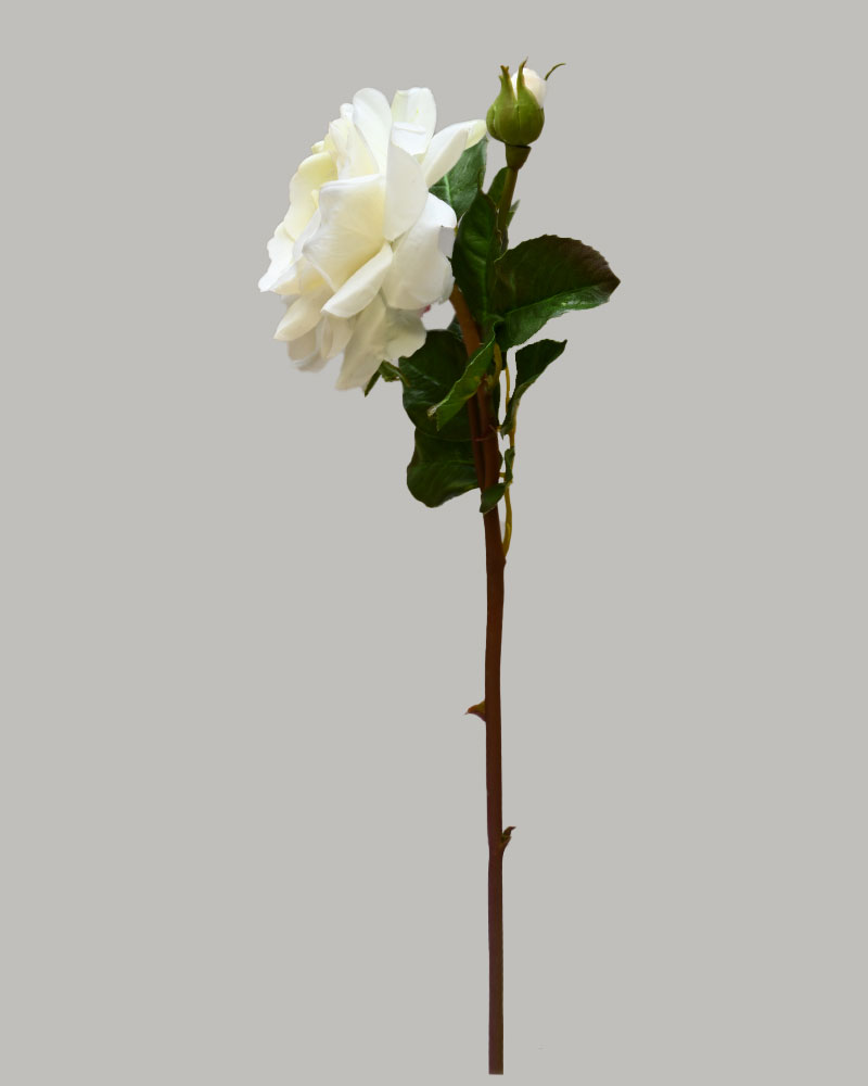 With one full bloom and a gently opening bud, this rose brings a soft yet stately presence to any arrangement. Delicate petals radiate from its open centre, and the elegant cream colour enhances its timeless beauty. Part of the natural touch lineup, the petals are soft to the touch—perfectly capturing the look and feel of a real rose. A stunning recreation of nature at its finest.