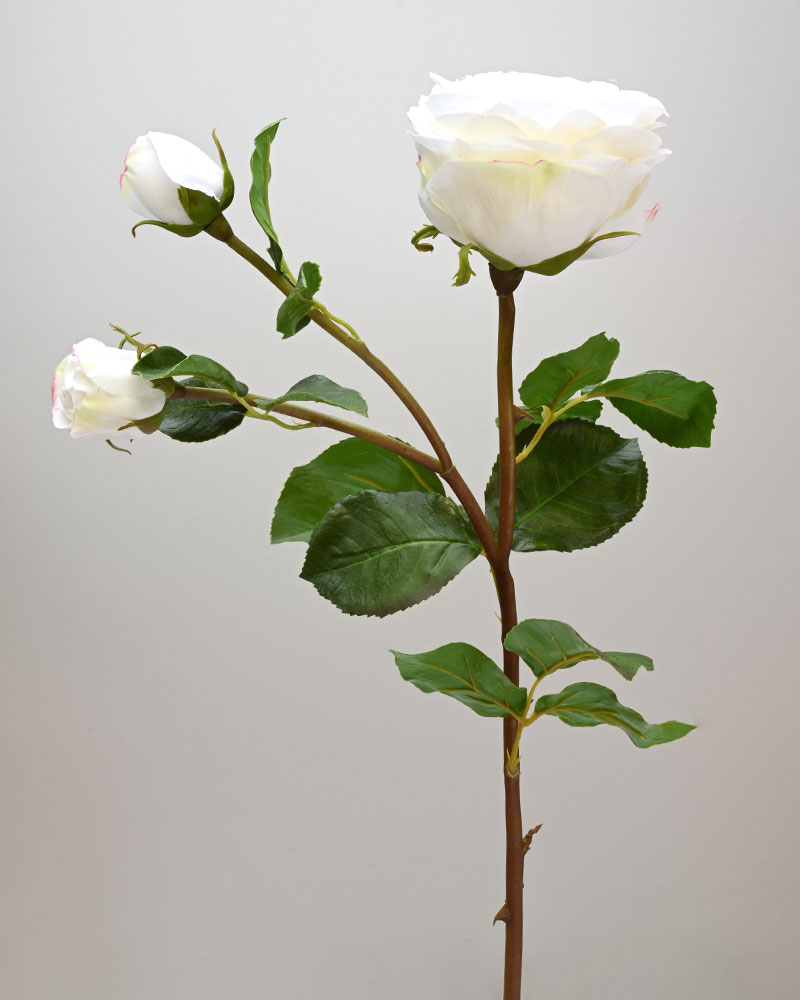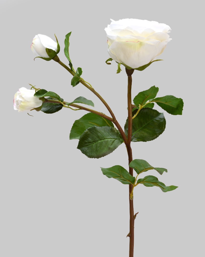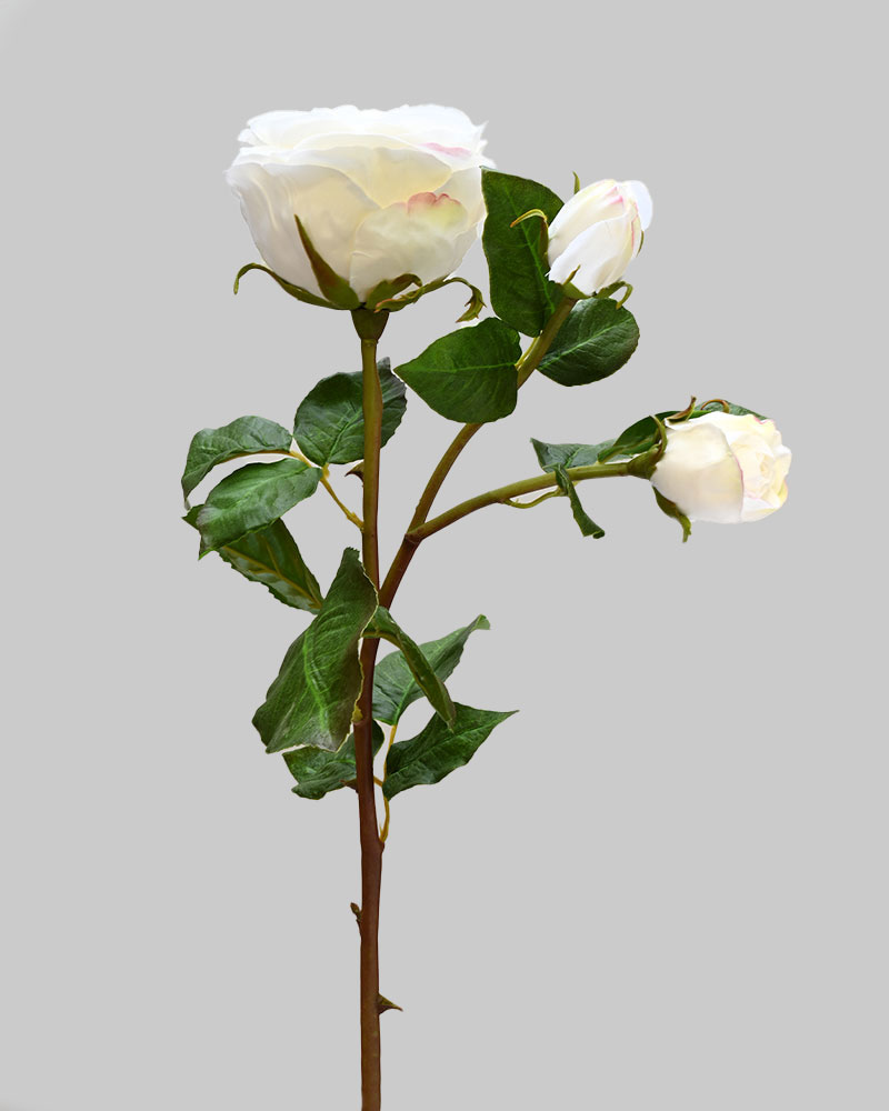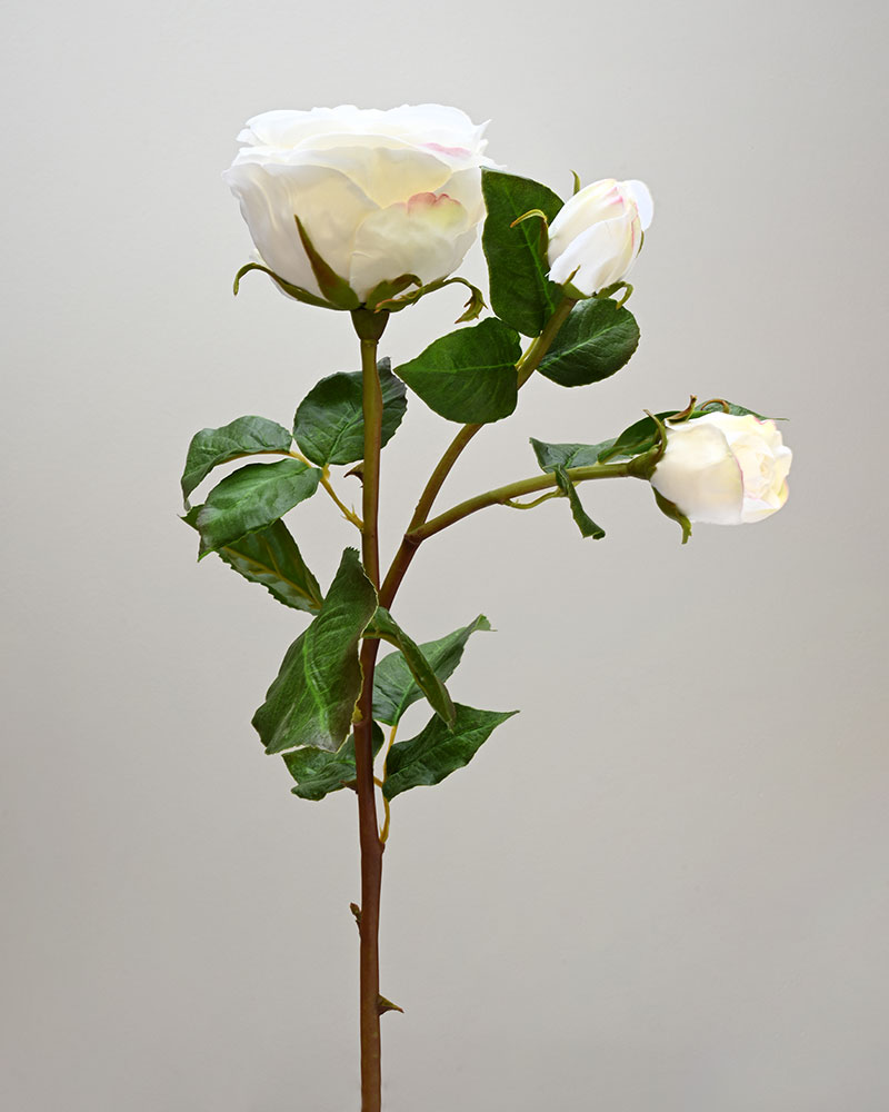 With one prominent bloom and two gently opening buds, this rose offers a soft yet stately presence, perfect for any floral arrangement. Its delicate petals radiate gracefully from the open centre, and the pure white hue adds a timeless elegance that elevates any setting.