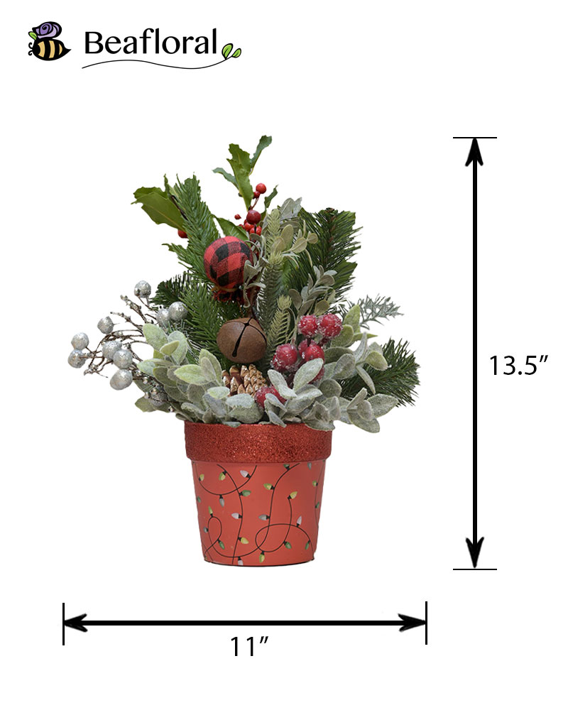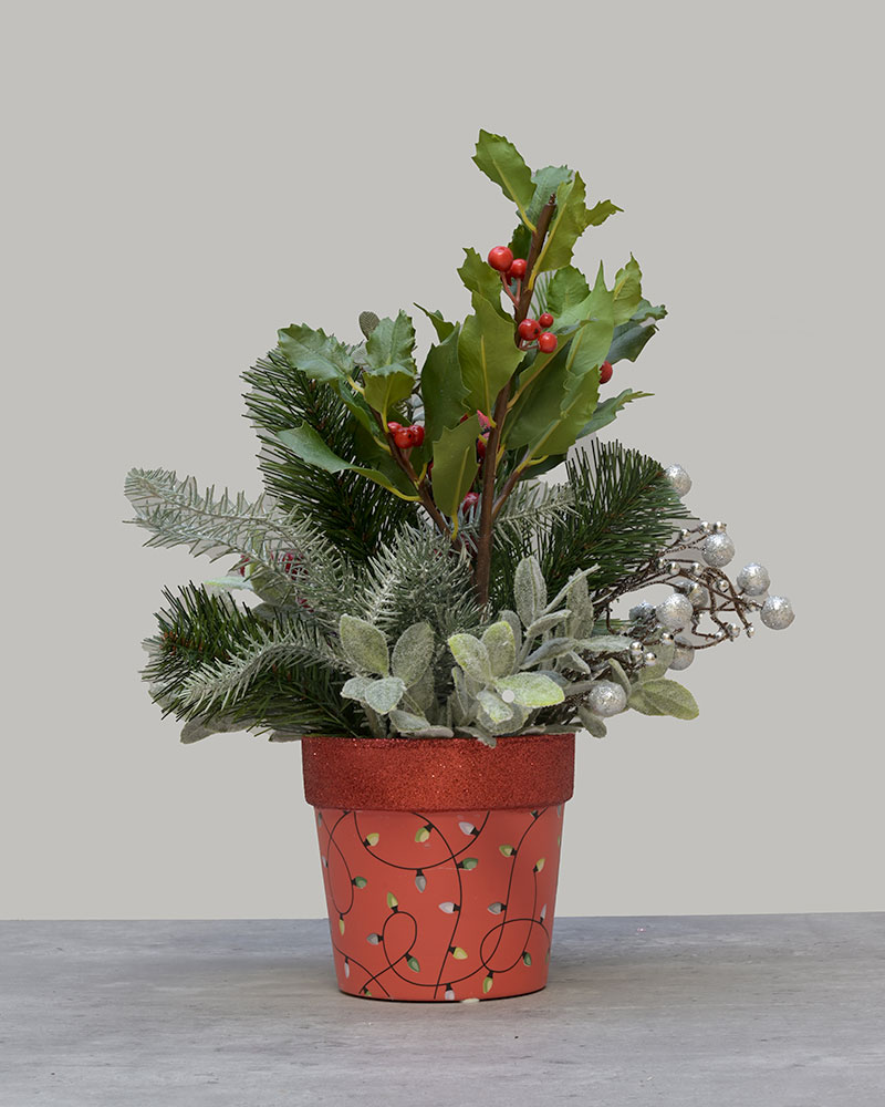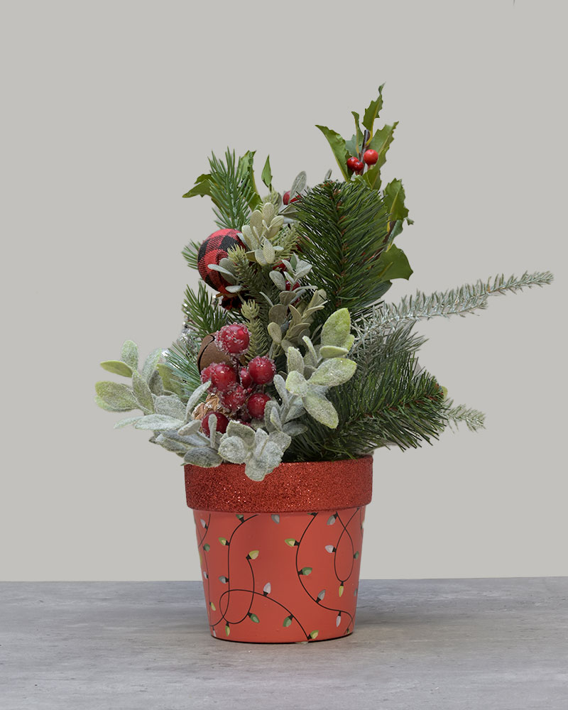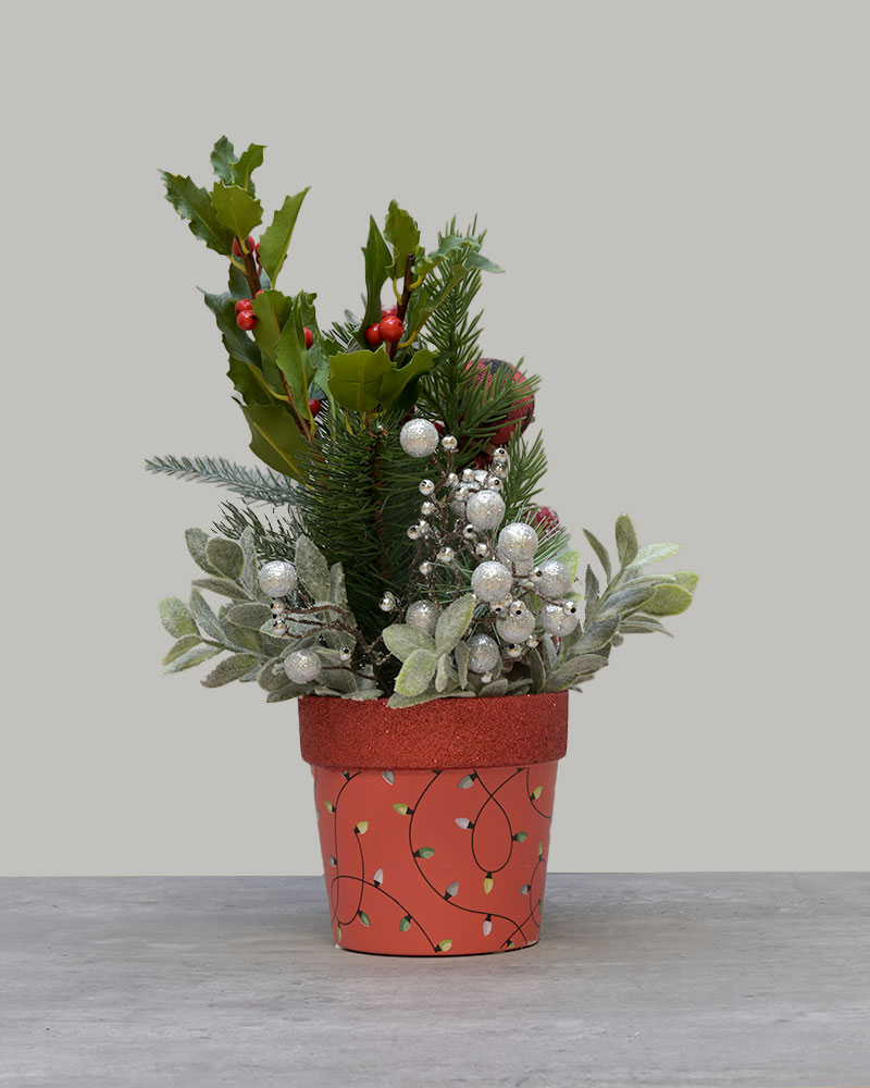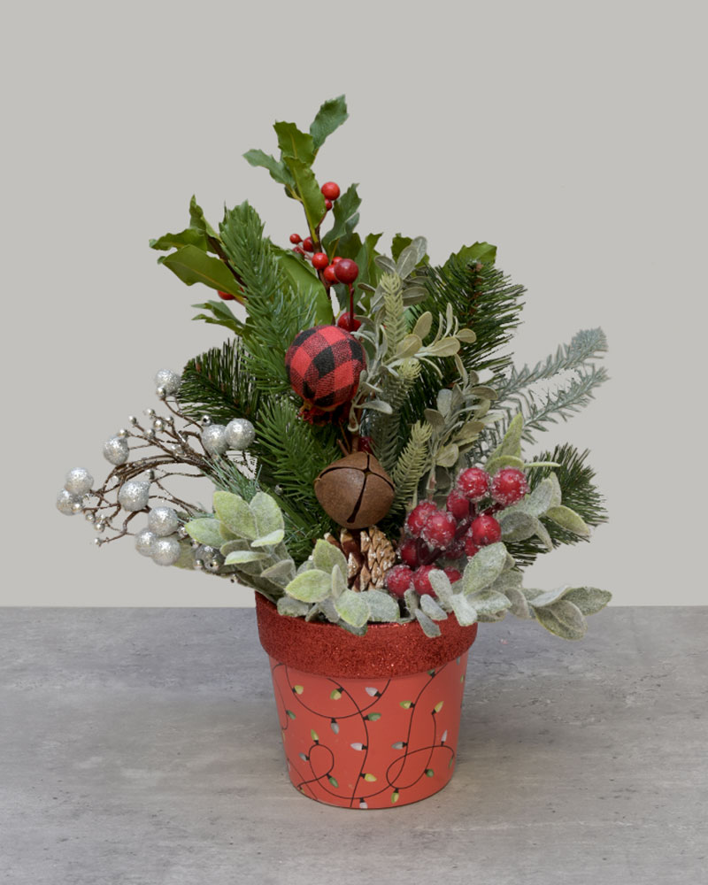 Bright, cozy, and full of holiday charm, Festive Forest (Red) brings a burst of festive spirit to any space. Frosted evergreens, sparkling silver accents, rich berries, pinecones, and rustic touches like buffalo plaid and jingle bells create a warm woodland look. The arrangement sits in a cheerful red pot decorated with a whimsical Christmas light pattern and a glittered rim, adding a vibrant pop of holiday colour. Perfect for mantles, countertops, office desks, or gifting, this joyful piece captures the magic of winter forests and classic Christmas décor.