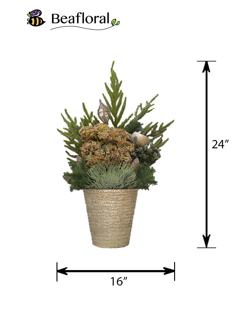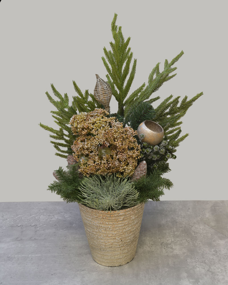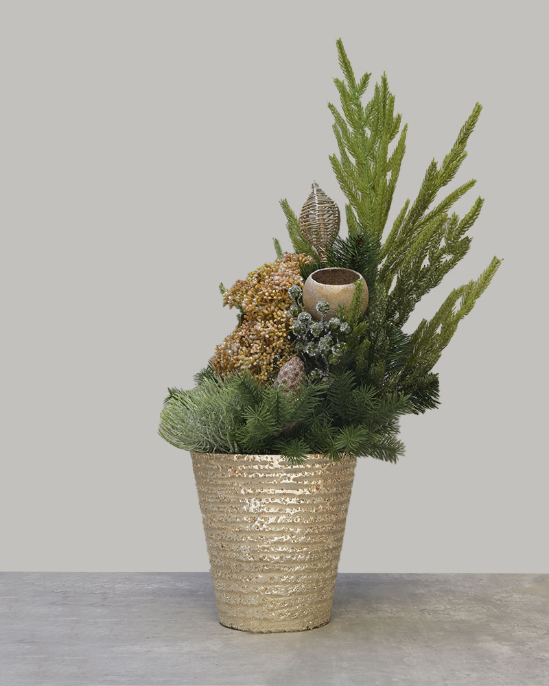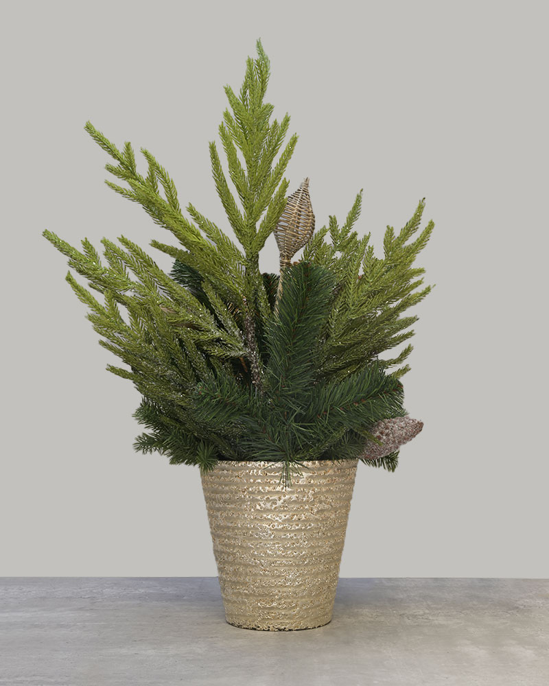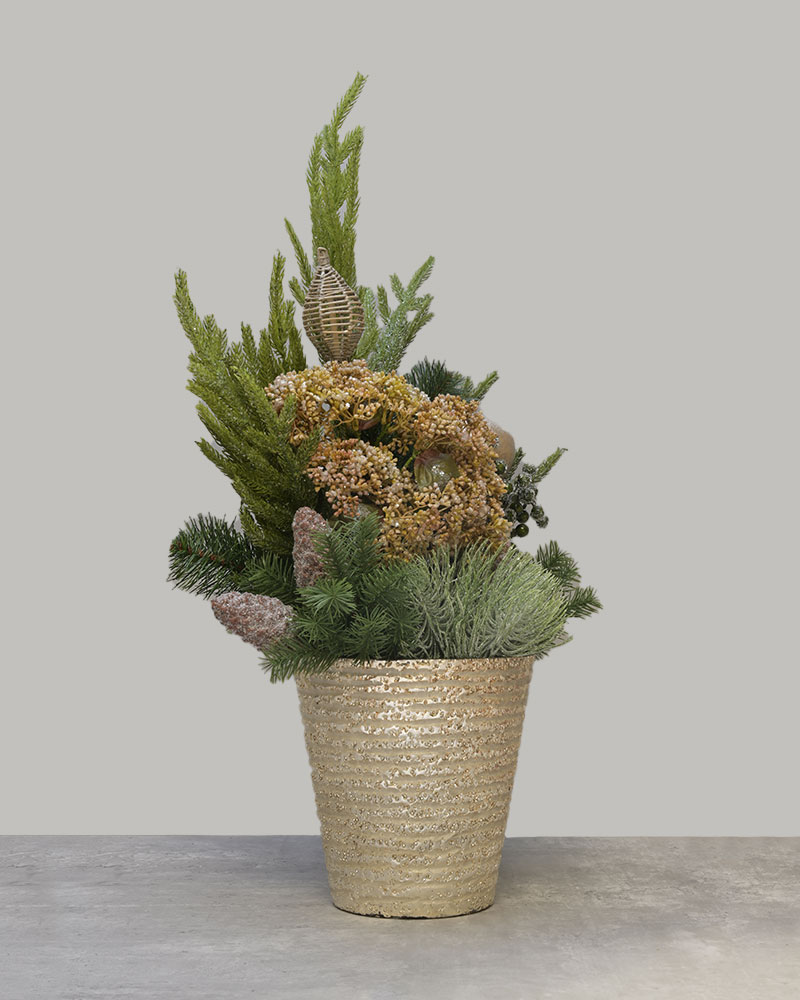 Festive Golden Evergreen brings a warm and elegant holiday glow to any space. This lush arrangement features layered evergreens, frosted accents, and gilded botanical details that create a rich, seasonal look. Soft gold textures and woodland-inspired elements add depth and charm, all presented in a shimmering gold pot that enhances its festive appeal. Whether placed on an entryway table, mantel, or office desk, Festive Golden Evergreen adds a refined touch of holiday beauty with a natural, timeless feel.