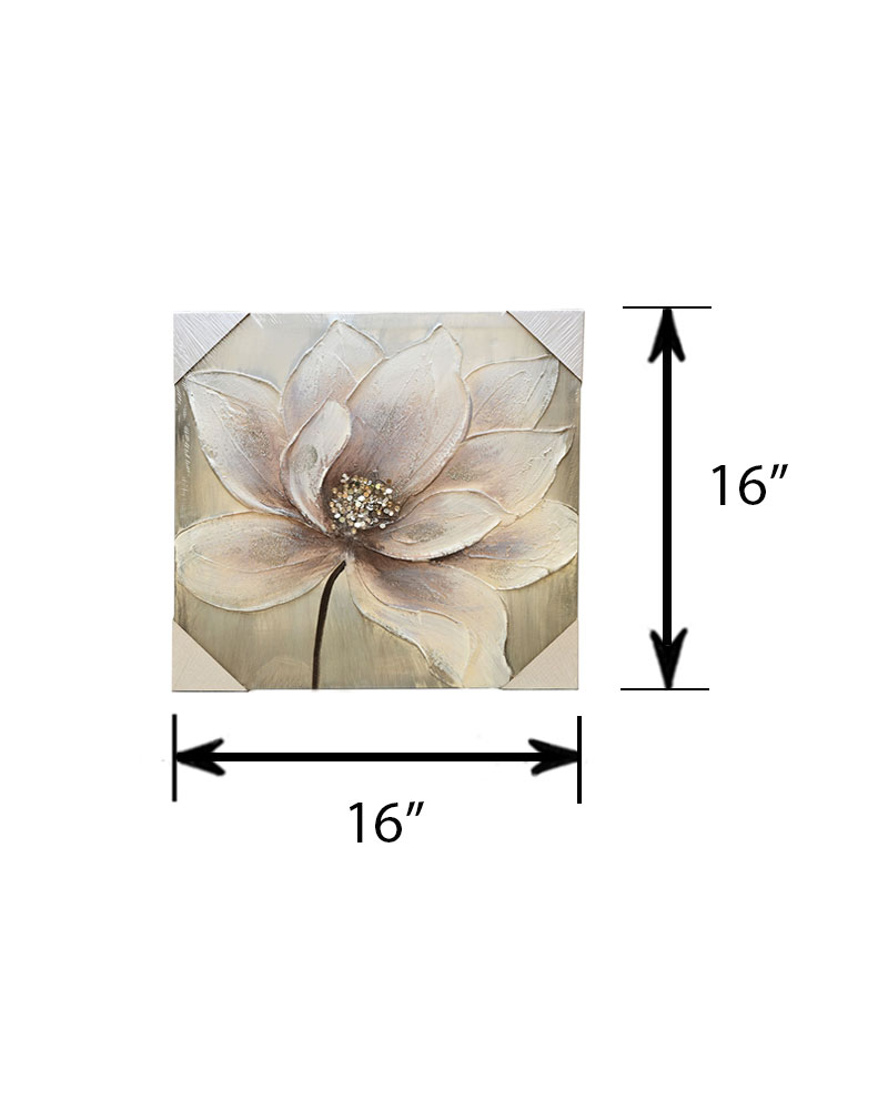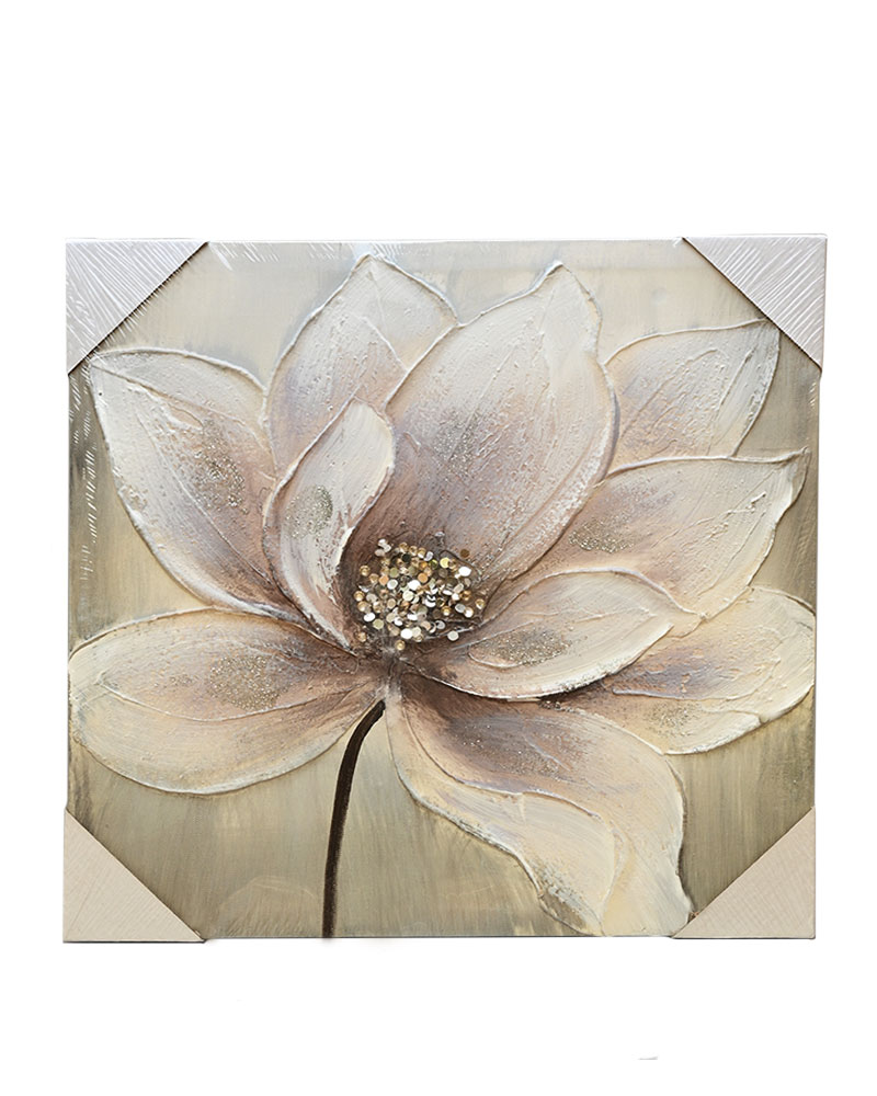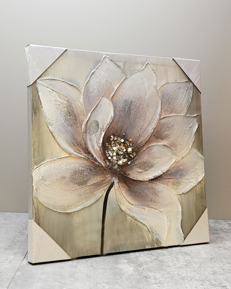 Painted on canvas, this flower is unique in colour, texture, and style. Featuring a sequined centre, the artwork adds a subtle sparkle that literally brightens any room it’s placed in. A beautiful blend of artistry and shimmer, this piece makes a charming and eye-catching addition to your décor.