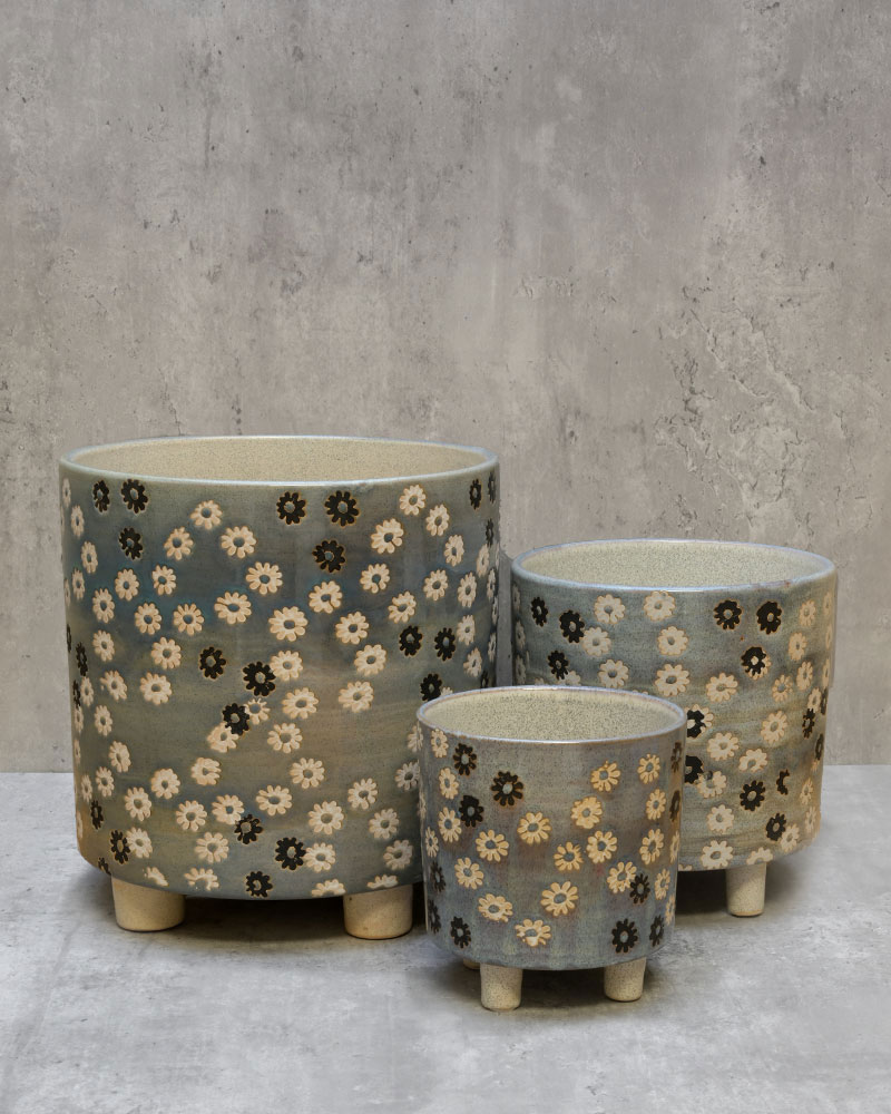 The perfect planter for a medium-sized plant or floral arrangement. Featuring its own raised feet and a charming daisy-like pattern, this container adds both style and personality—sure to impress in any space!