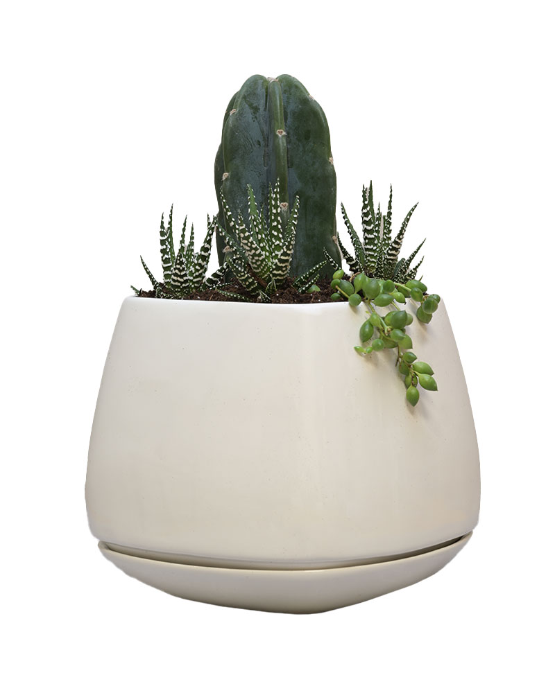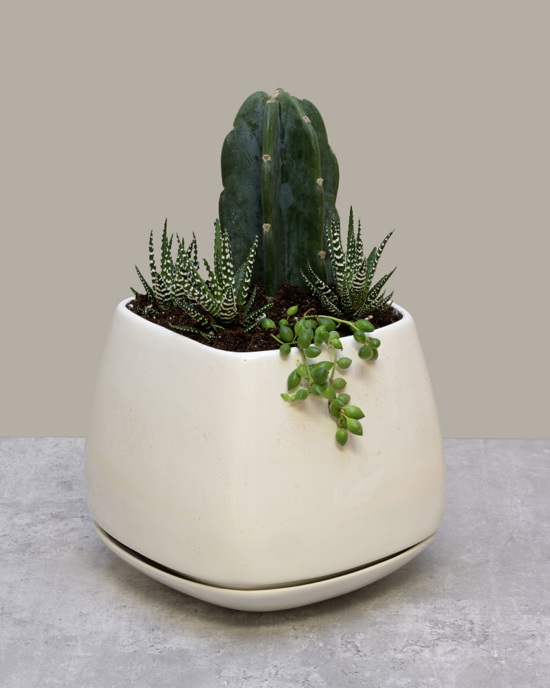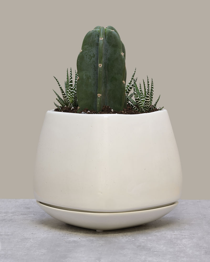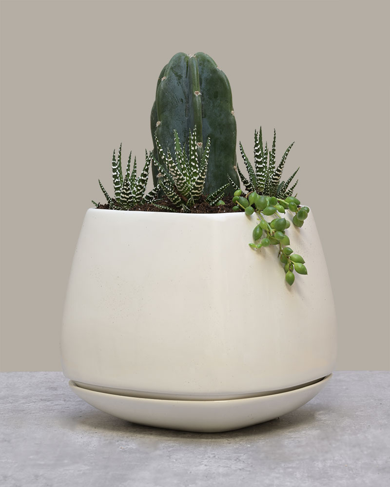Soft, sculptural, and quietly striking - Gentle Giant celebrates the beauty of contrast. A tall, elegant cactus rises from a modern rounded planter, surrounded by petite succulents and trailing greenery. The result is a refined desert-inspired arrangement that feels both strong and soothing, bold yet delicate.