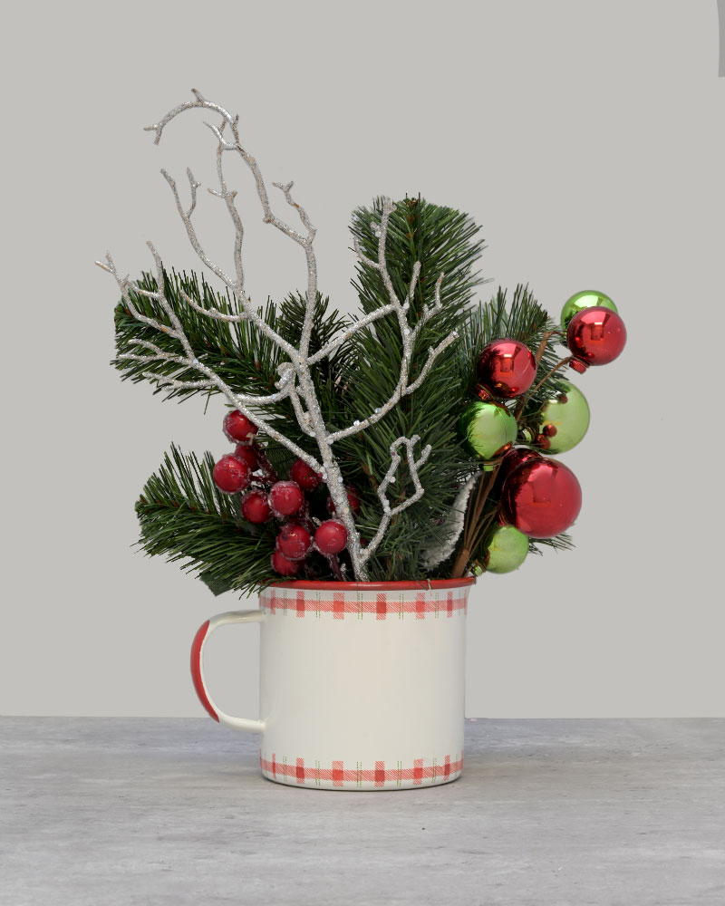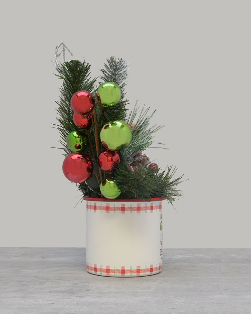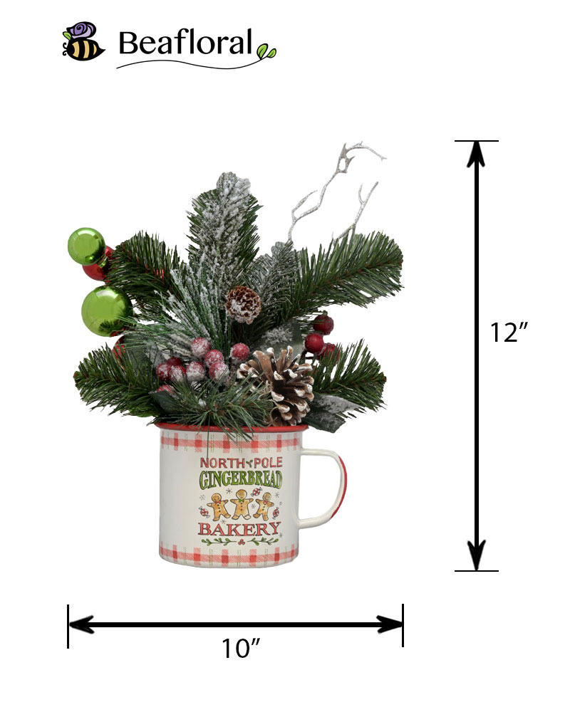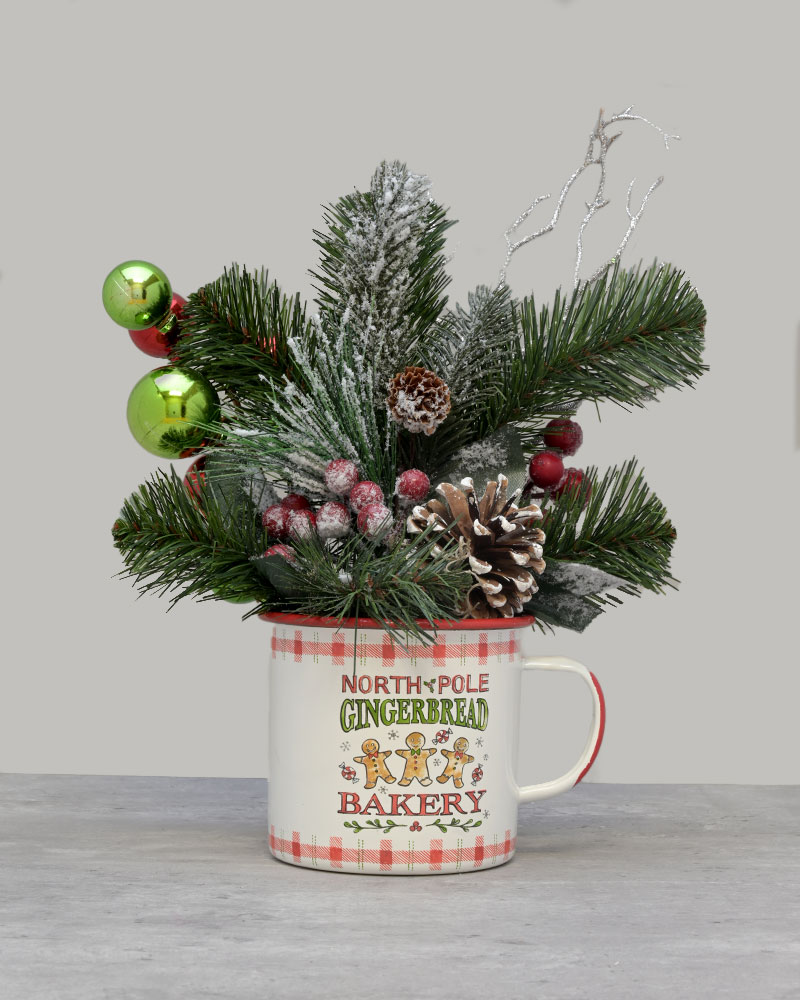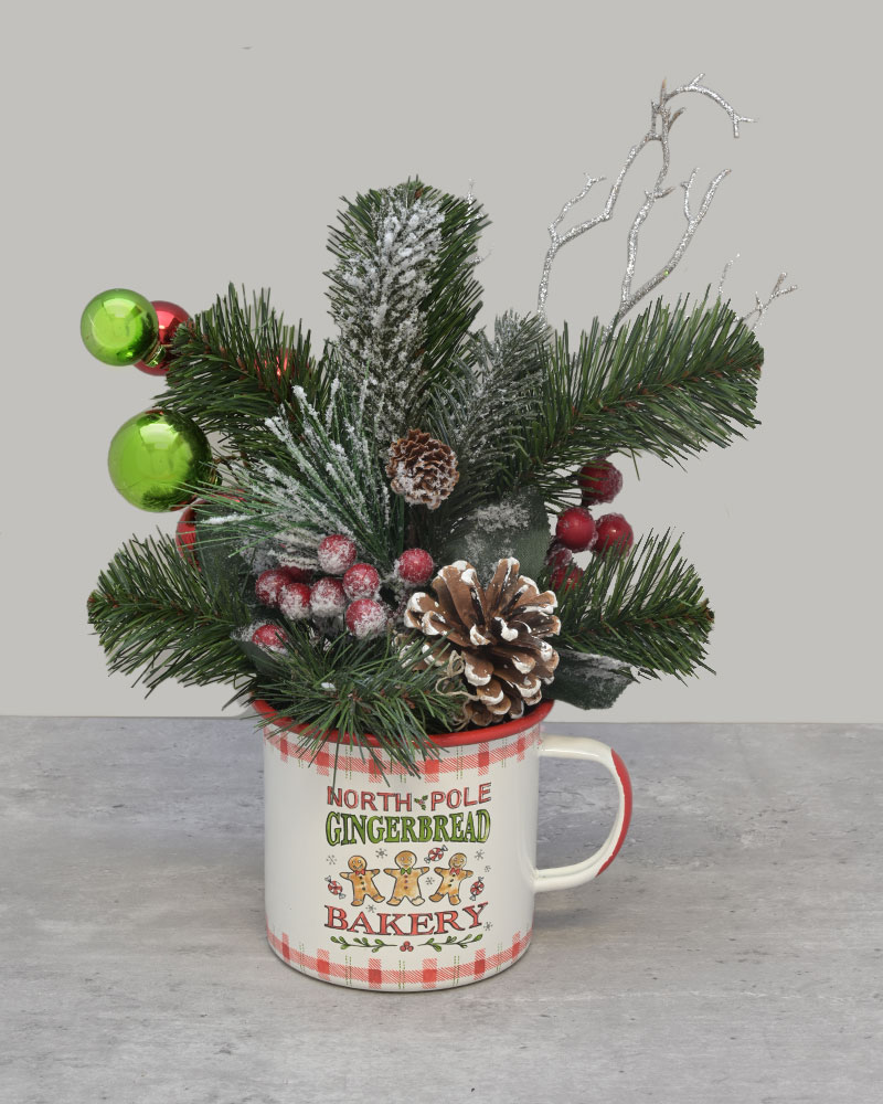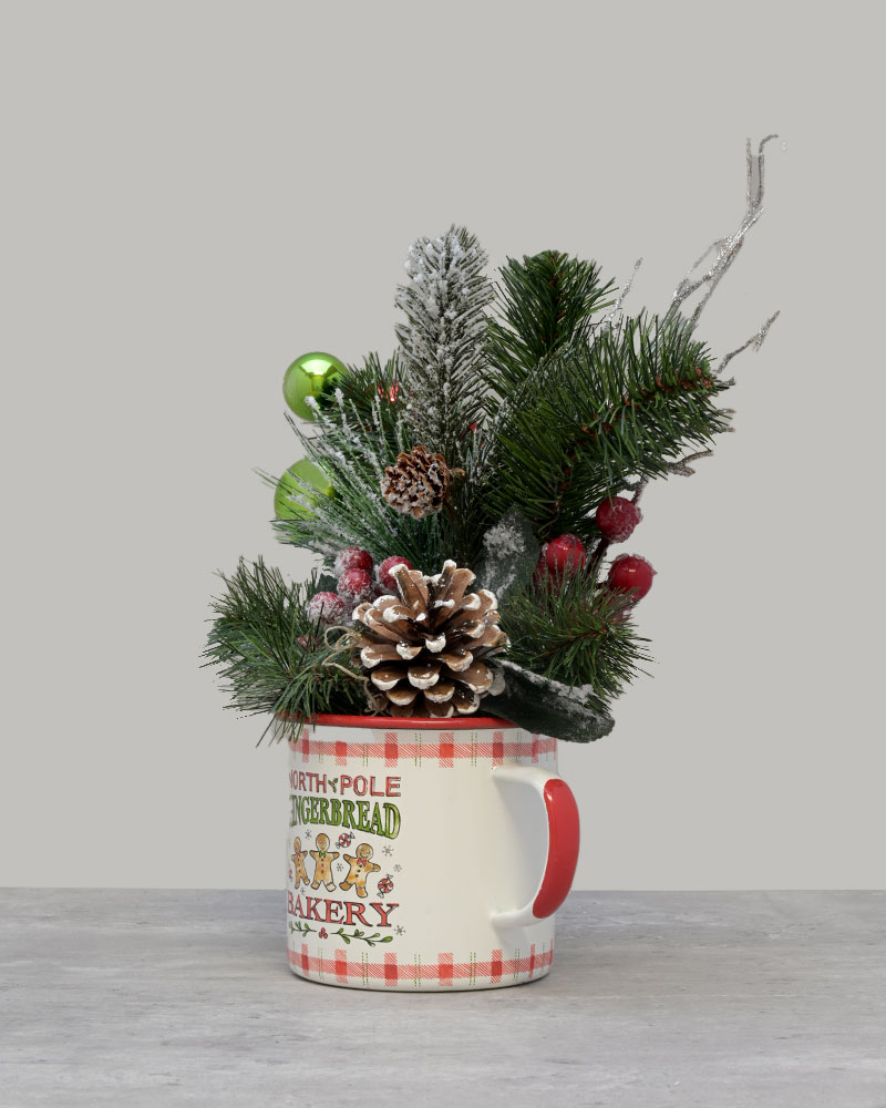 Sweet, festive, and full of holiday charm, this Gingerbread Cheer Mug brings the magic of the North Pole right into your home. Designed in a vintage-style "North Pole Gingerbread Bakery" mug, it features frosted evergreens, bright berries, pinecones, and shimmering ornaments for a cheerful Christmas touch. Perfect for desks, countertops, kitchen décor, or as a delightful holiday gift, this arrangement captures the cozy spirit of fresh-baked treats and winter mornings.
