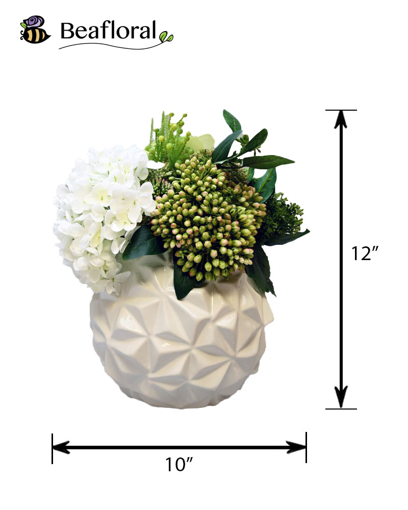 A perfect touch of green is beautifully showcased in this elegant white prismed container, whose geometric design adds a modern sophistication. At the heart of the arrangement, a large, lush hydrangea commands attention with its voluminous blooms and soft texture. Surrounding it, clusters of sedum and other varied greenery bring depth and contrast, creating a rich tapestry of natural tones. This harmonious combination forms a refreshing bundle of green joy that feels both calming and uplifting. Whether displayed on a small end table or taking centre stage on a prominent piece of furniture, this subtle yet striking arrangement adds a refined elegance that won’t disappoint.