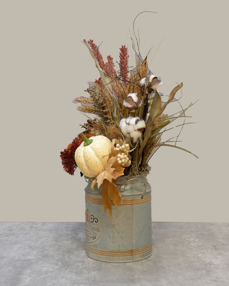 Add a touch of rustic charm to your home this autumn with this beautifully arranged seasonal display. Set in a vintage-style metal container featuring a classic harvest label, this arrangement showcases a variety of textured, nature-inspired elements in warm, earthy tones. Perfect for creating a cosy and inviting atmosphere, it makes a lovely accent for your Thanksgiving table, mantel, or entryway. With its timeless farmhouse appeal, this piece is a stylish way to celebrate the beauty of the fall season.