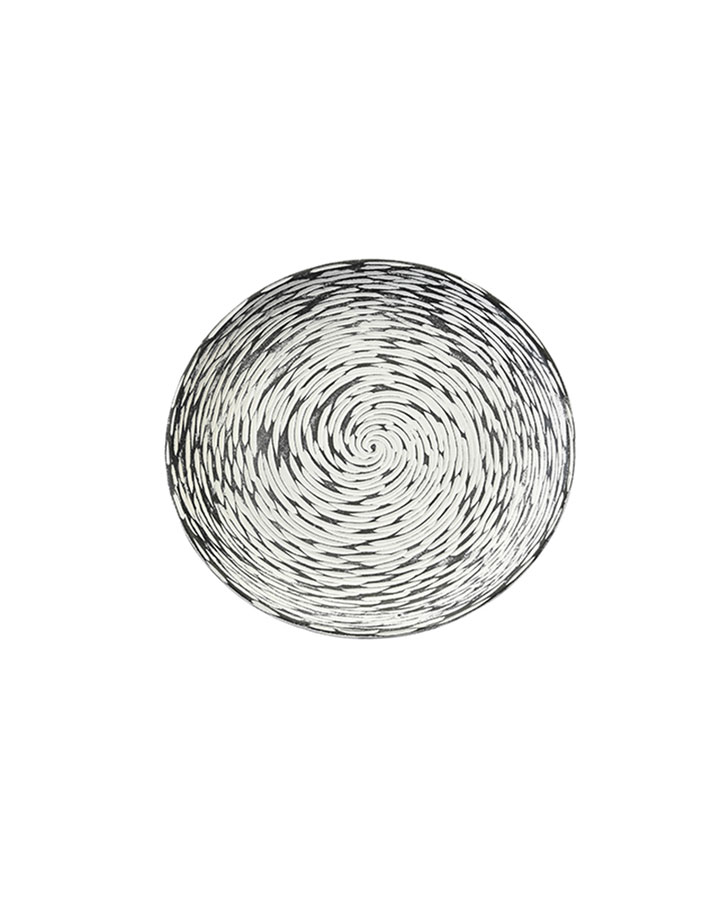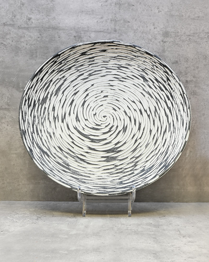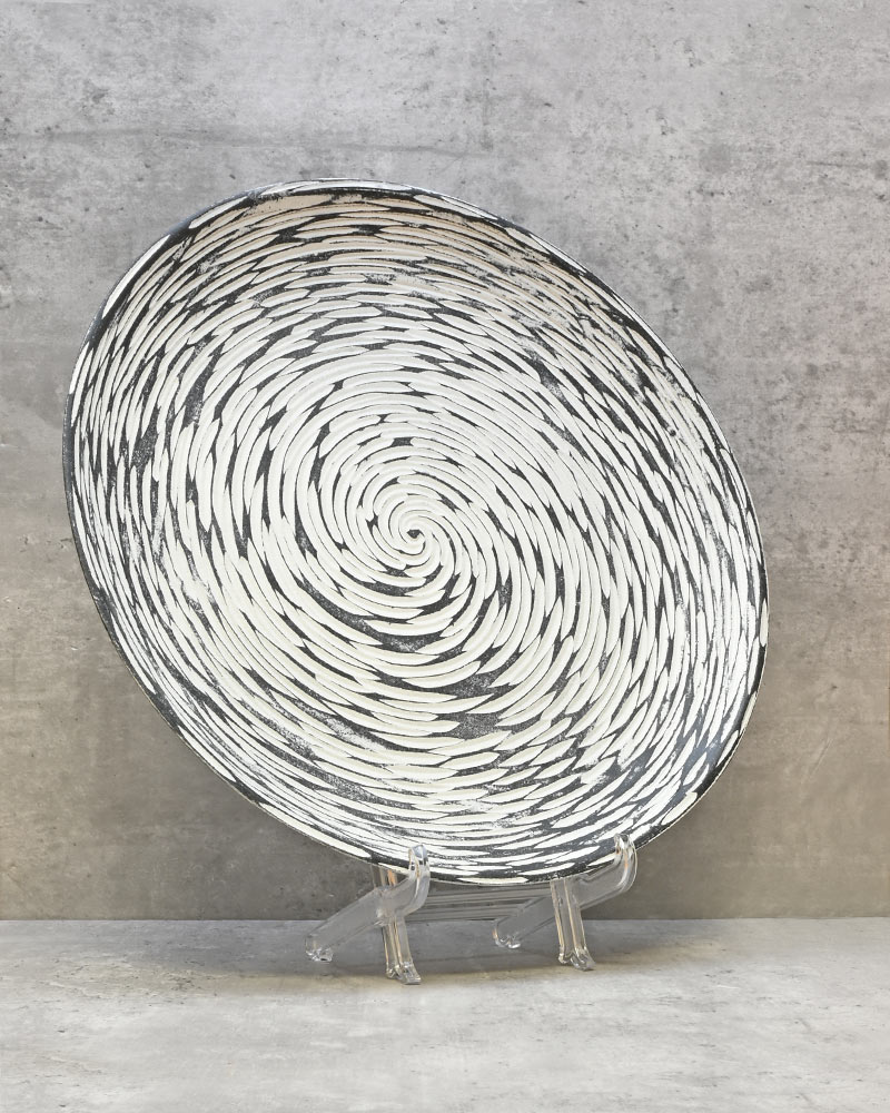 This decorative plate features a circular pattern with textured white swirls set against a black background. The textured finish adds visual interest, making it perfect for displaying decorative accent pieces or standing out beautifully on its own.