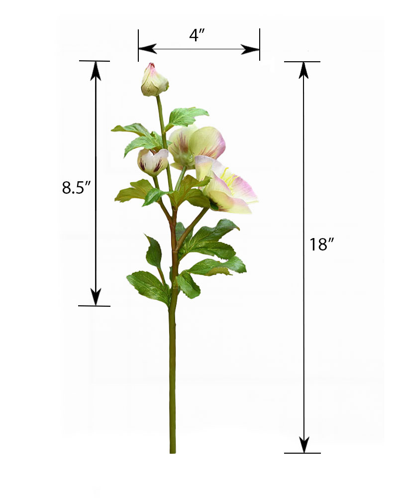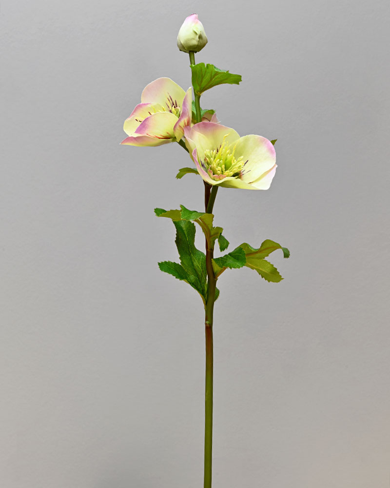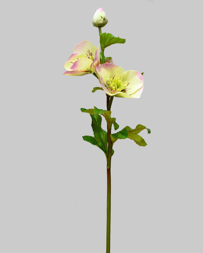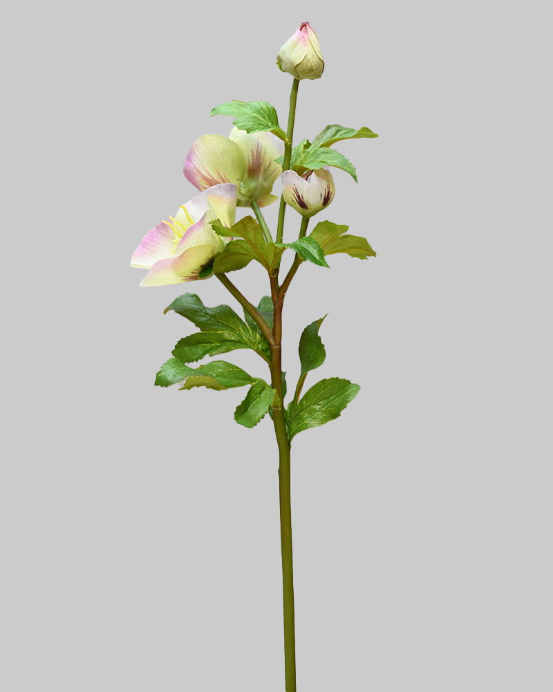 The Hellebores is a delicate and elegant flower showcasing soft green petals gently kissed with pale lavender edges. Crafted with a natural touch, each bloom captures the subtle texture and lifelike details of real flowers. Multiple blossoms gracefully adorn a single sturdy stem, creating a layered and captivating display. This stem adds a unique, soothing blend of colours, perfect for bringing understated charm and sophistication to any arrangement.
