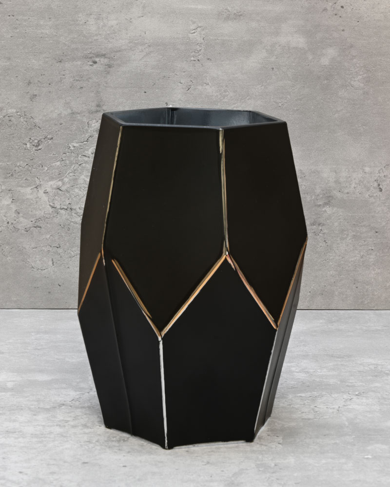 This hexagonal black glass container, highlighted by sleek silver-coloured edges, offers a modern twist on the classic glass vase. Its geometric shape and deep black colour create a bold, sophisticated look, while the silver trim adds a subtle touch of elegance. Paired with vibrant floral arrangements, this container becomes a striking focal point and conversation starter. Perfect for adding style and refinement to any décor.