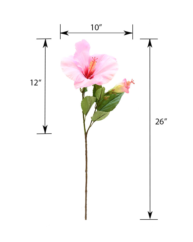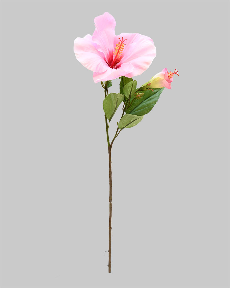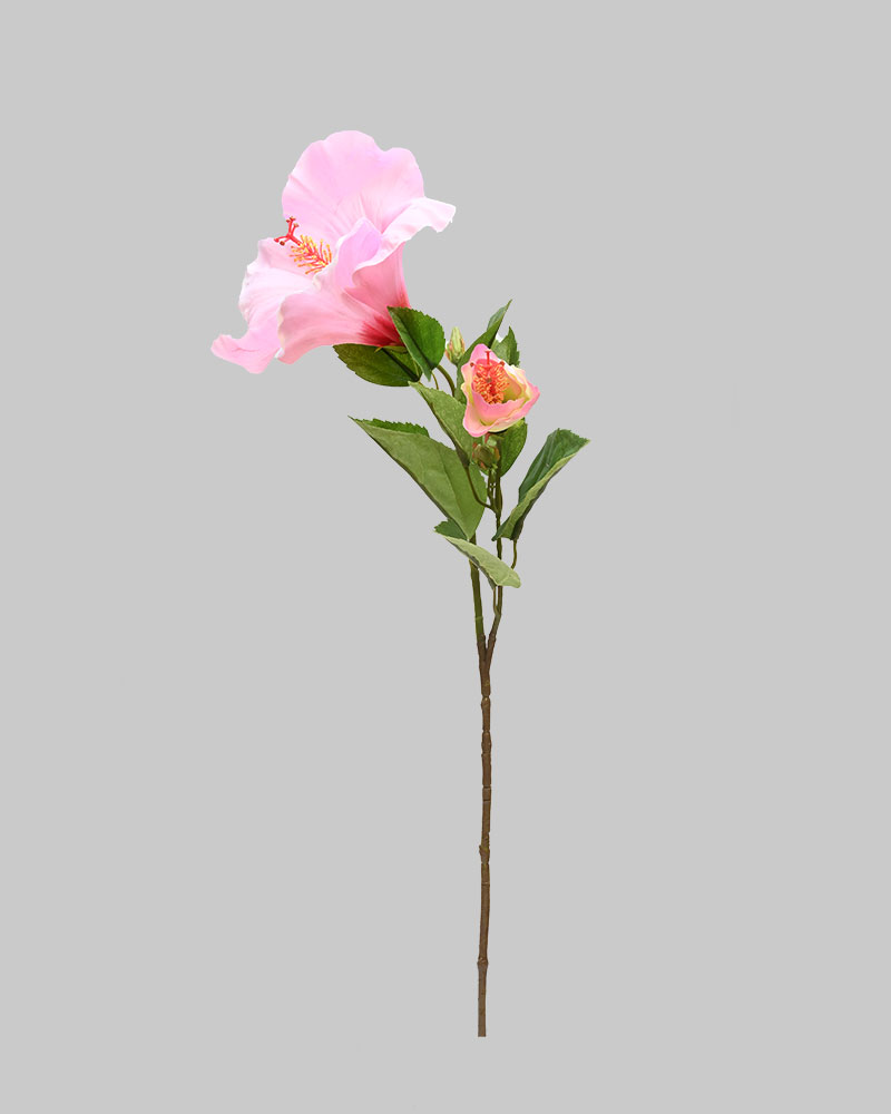 This stunning hibiscus stem features a large, fully opened bright pink flower alongside a delicate bud beginning to bloom. Known for its bold, vibrant petals, the hibiscus brings an exotic, tropical vibe to any arrangement or space. Perfect for adding a splash of colour and natural elegance to your home, this stem makes a striking statement whether used alone or combined with other florals.