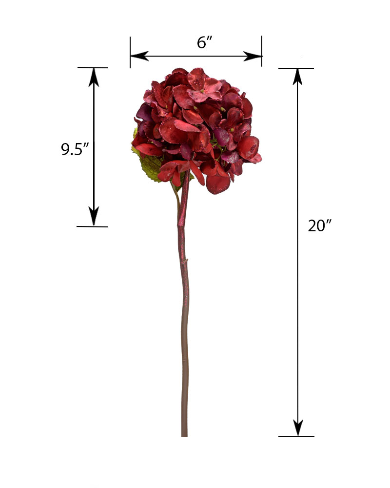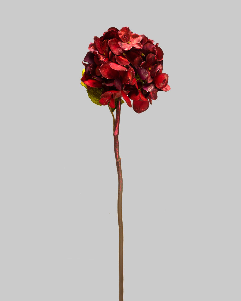 This red hydrangea stem captures the richness and warmth of the holiday season. Its velvety petals blend deep red and subtle purple hues, beautifully accented with fine red glitter along the edges for a touch of festive sparkle. The full, lush bloom and lifelike leaves make it a stunning addition to Christmas arrangements, wreaths, or elegant centrepieces. Perfect for adding depth, colour, and a luxurious glow, this hydrangea brings timeless holiday elegance to any décor.