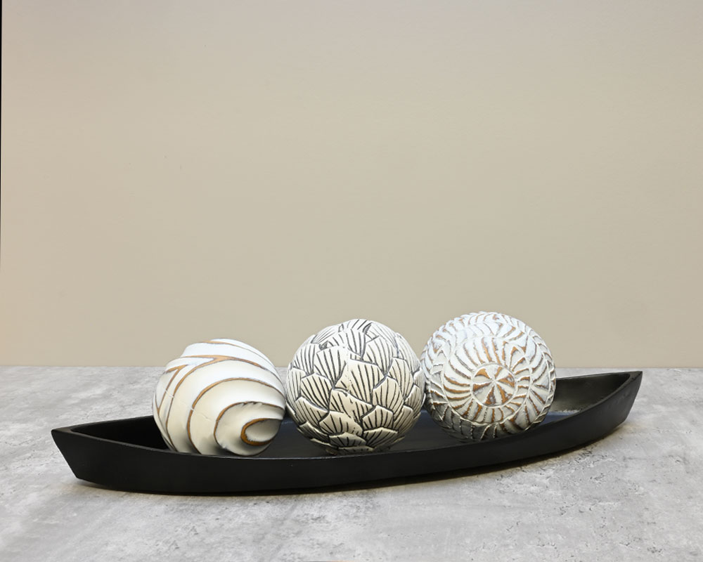 Rustic yet elegant, this low-profile, canoe-shaped platter brings a unique charm to any table, shelf, or mantle. Its distinctive shape makes it a perfect base for decorative accents, helping to create a striking and stylish display in any room.