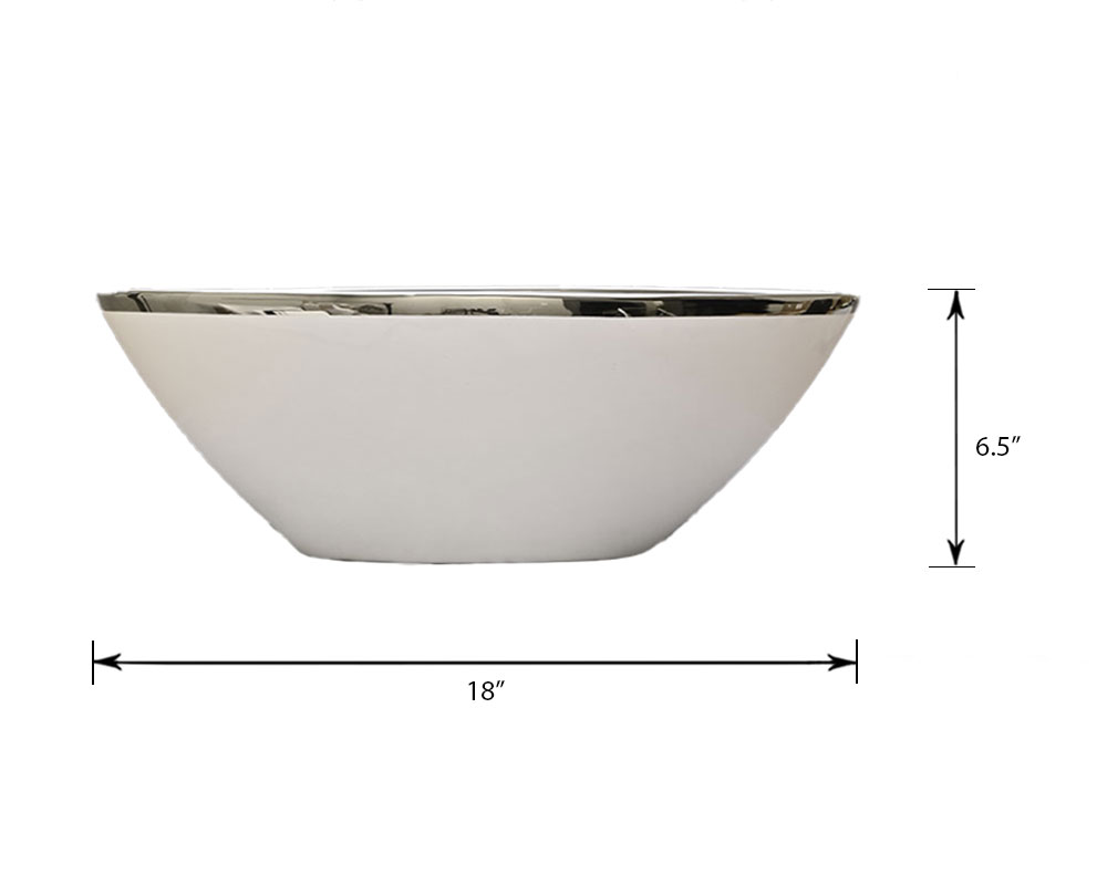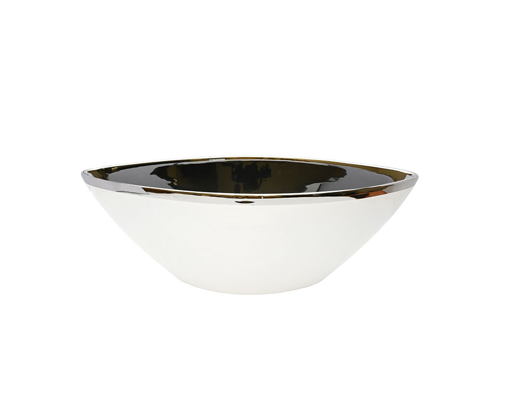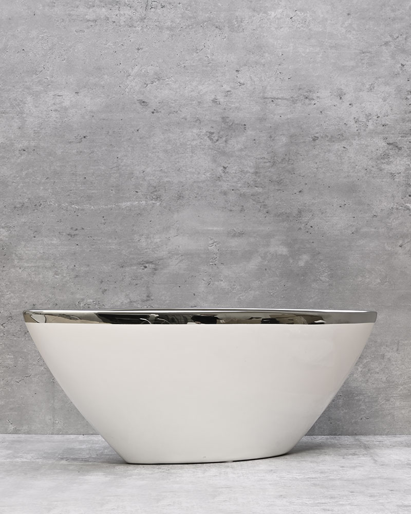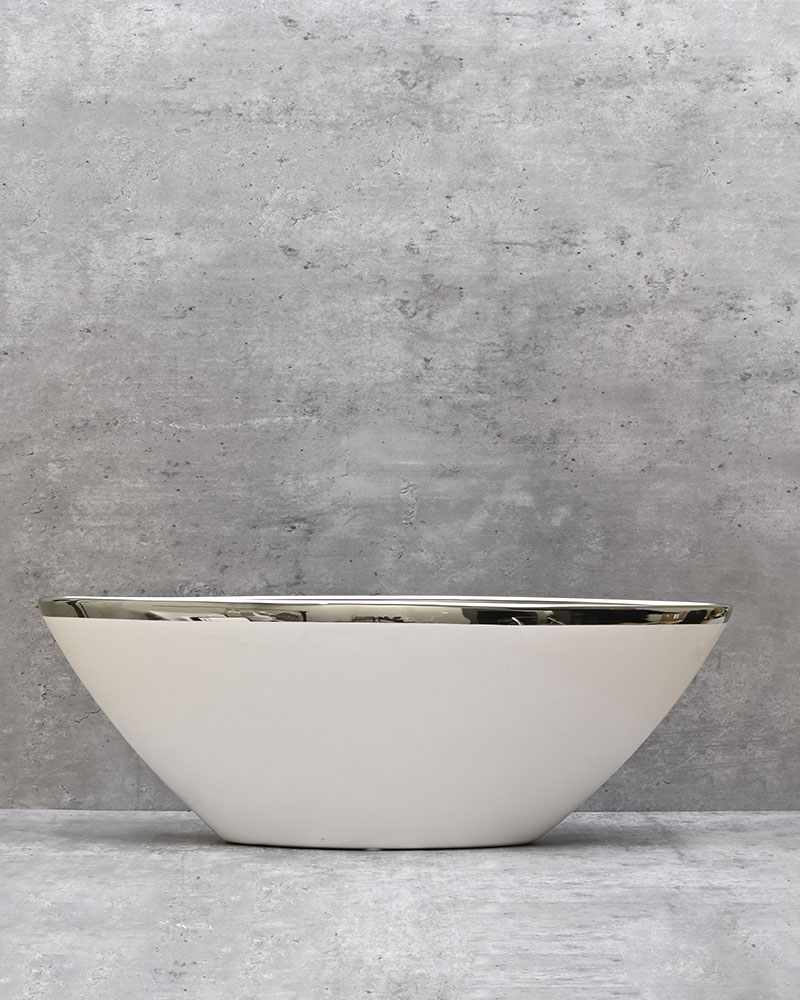 This modern “boat” bowl features a sleek ceramic gloss white exterior paired with a shiny metallic interior, creating a striking contrast in both colour and finish. Unique in shape and style, it’s a standout piece that adds a bold, contemporary touch to any space.