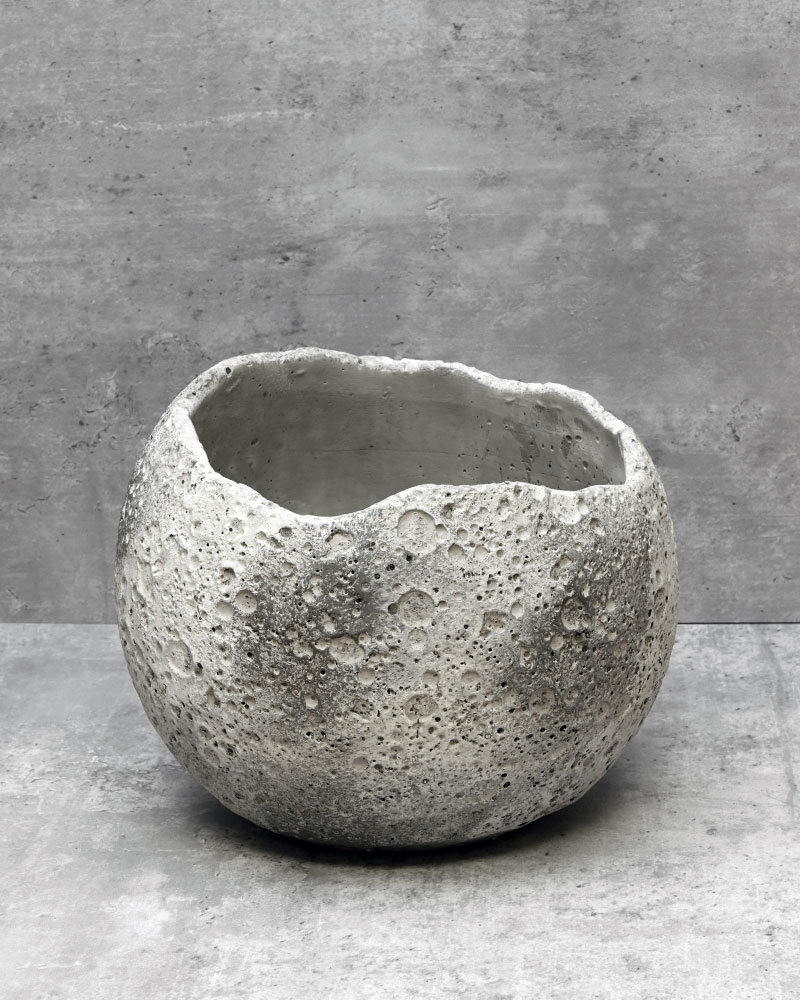 This unique container beautifully mimics the moon, complete with crater-like details and a rocky-textured exterior. The soft blend of grey and white hues enhances its lunar-inspired design, making it a perfect statement piece for any space.