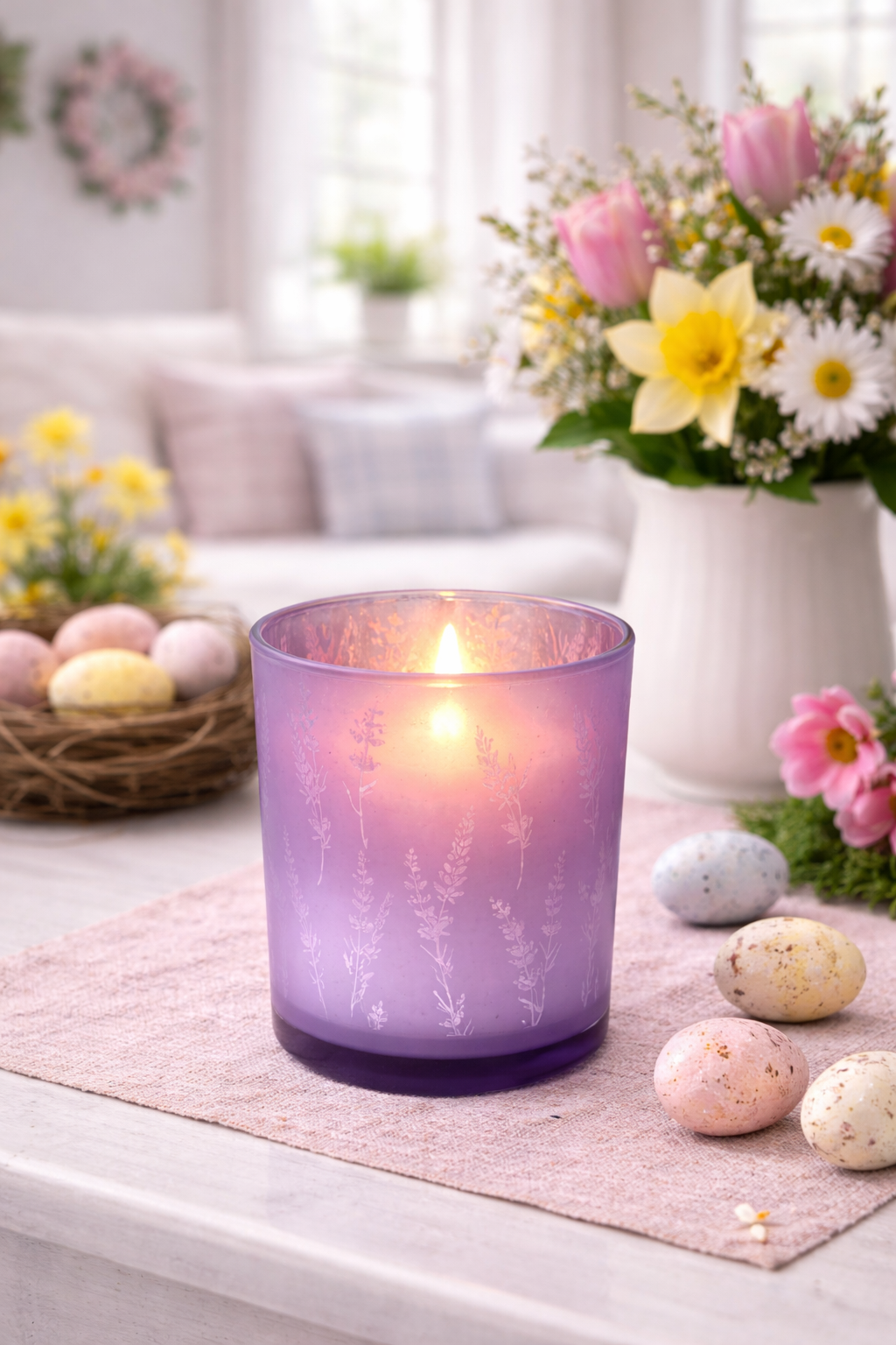 With a purple mirror finish and a delicate lavender silhouette pattern, this container offers a subtle yet elegant look. When lit from within, the design comes to life—highlighting the intricate detail and enhancing its full visual impact. A beautiful piece that adds both charm and sophistication to any setting.