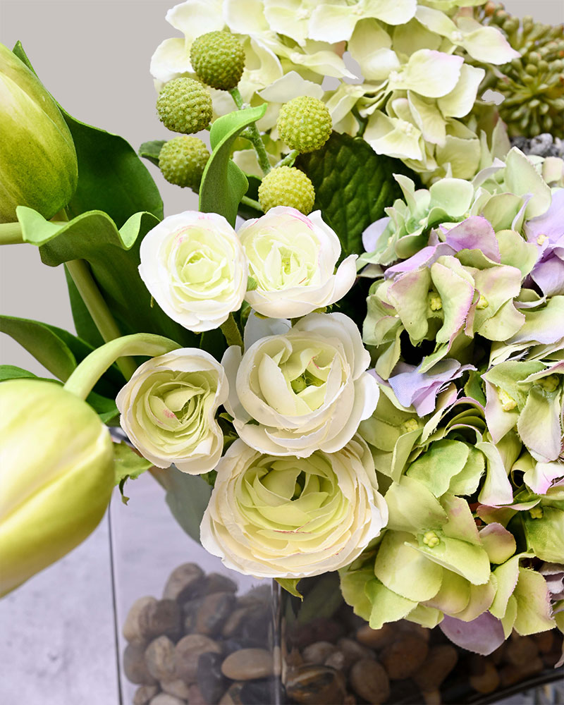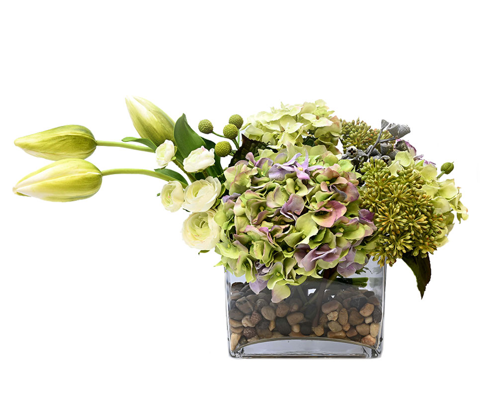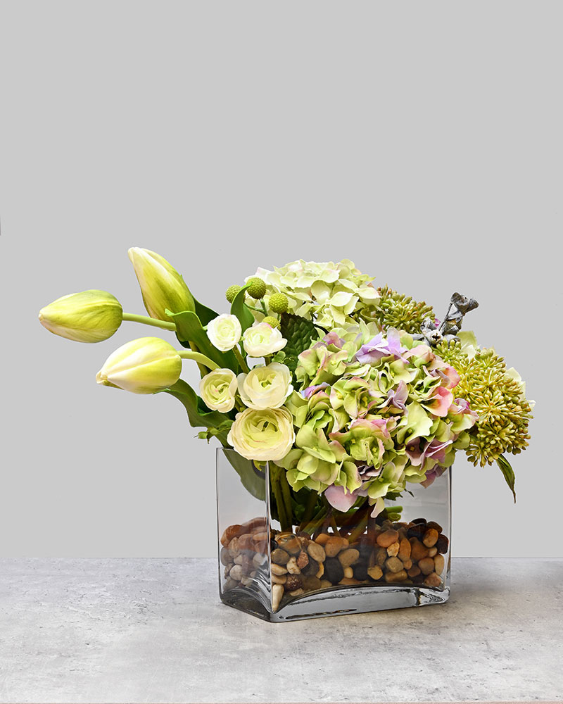 Elegance and class come together in this captivating arrangement, where cool green hues blend seamlessly with warm purple tones to create a harmonious and eye-catching display. The interplay of textures and shapes adds depth and interest, making it a standout piece in any setting. Lush hydrangeas and graceful tulips fill a sleek glass vase, their petals softly contrasting while complementing each other perfectly. The arrangement is anchored by a base of smooth river rocks, adding an earthy element that enhances the overall sophistication. This combination brings a refined yet inviting atmosphere, perfect for brightening up any room with style and charm.