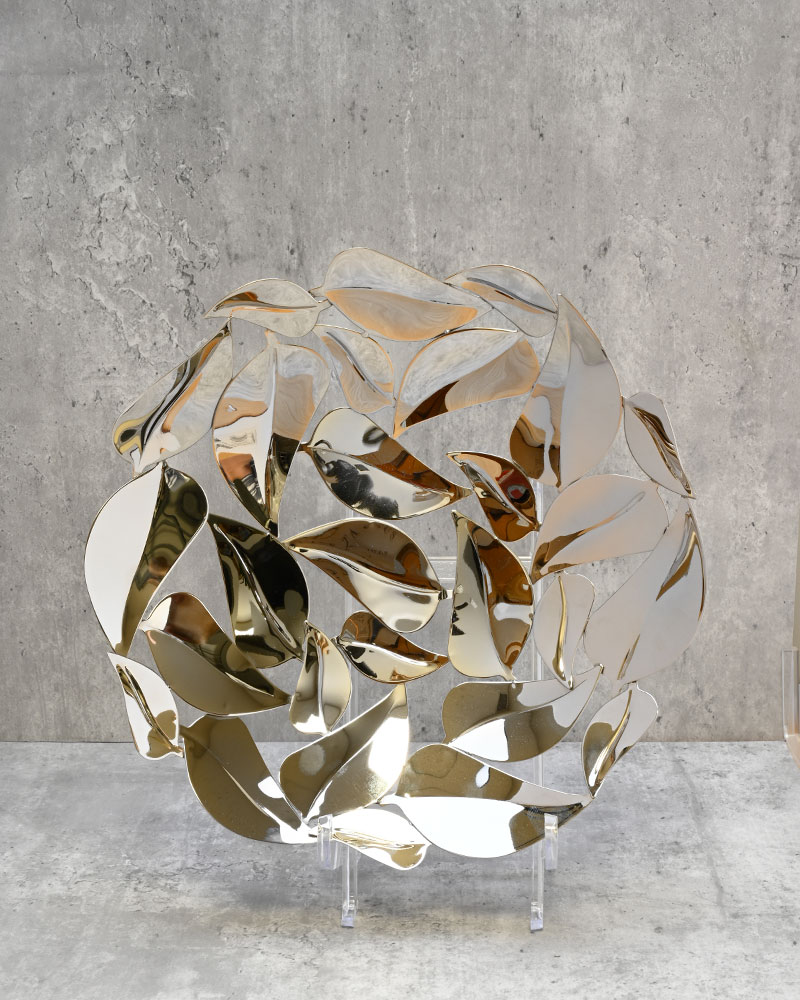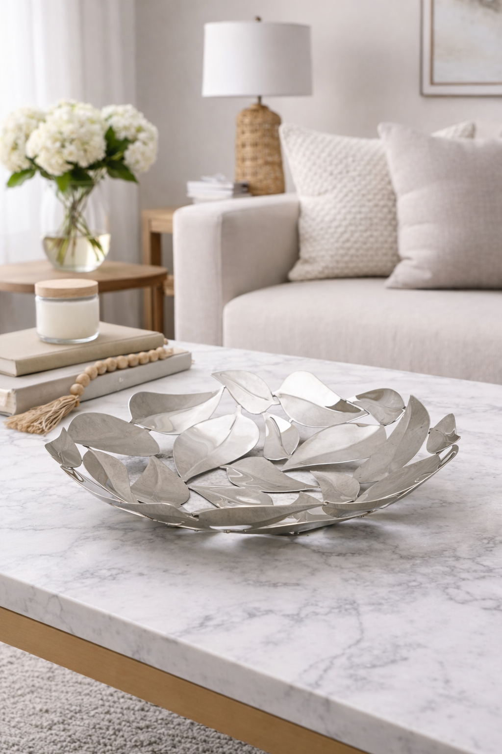 This leaf-shaped decorative bowl features a polished chrome finish that adds a sleek, modern touch to any table or countertop. Its unique pattern and reflective surface make it ideal for displaying faux fruit or other decorative accents, bringing a contemporary elegance to your space.