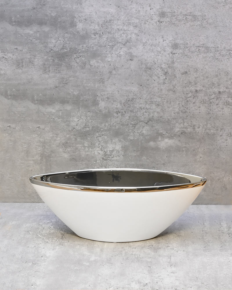 This modern “boat” bowl features a sleek ceramic gloss white exterior paired with a shiny metallic interior, creating a striking contrast in both colour and finish. Unique in shape and style, it’s a standout piece that adds a bold, contemporary touch to any space.